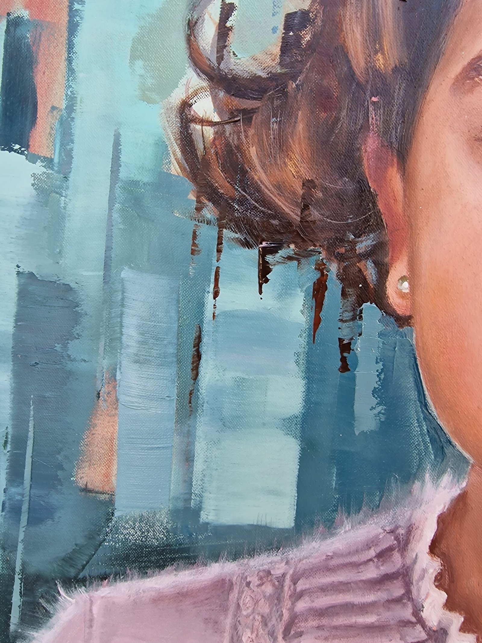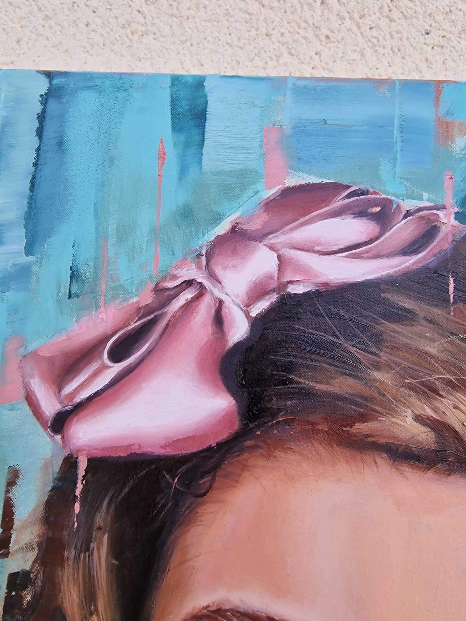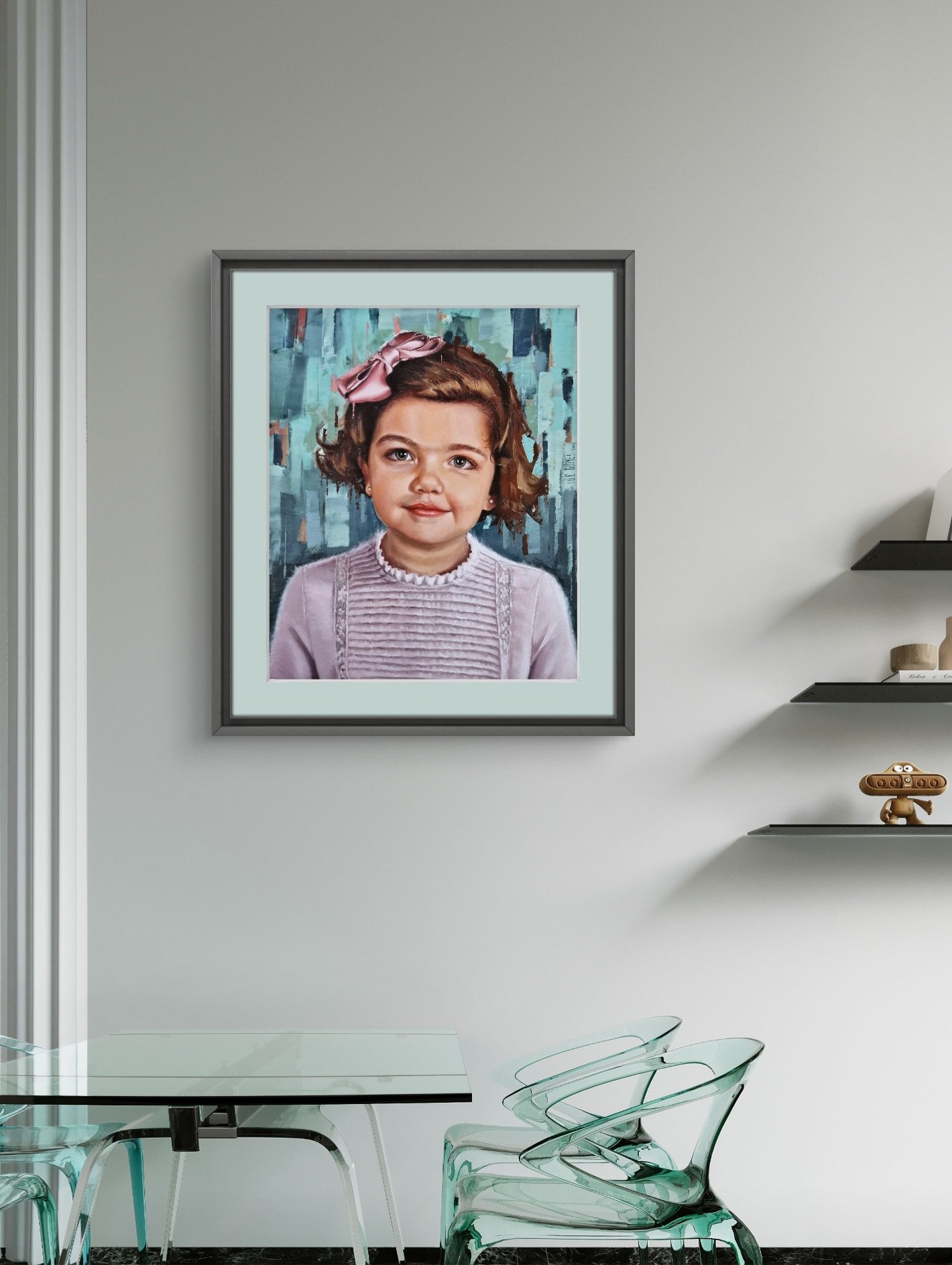 I chose a background that’s abstract and textured, almost like a dream, so that nothing competes with her presence. The soft colors let her personality shine through, bringing her energy to the forefront. Those small details—the delicate bow, the gentle expression—are reminders of the fleeting nature of childhood moments, as if they were captured in a quiet pause before they drift away. More than physical features, I wanted to capture that spark of joy and the simplicity of being, where everything feels right, and the world around her fades gently into the background.