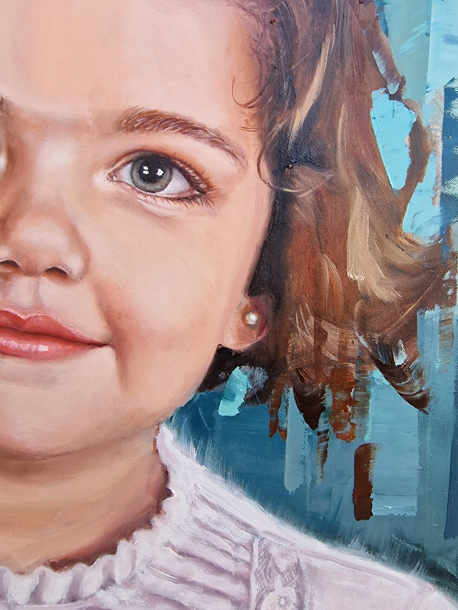 Each portrait is an attempt to capture the essence of a unique moment, where words aren’t necessary. In this painting of little Carmencita, I wanted to reflect her innocence and charm, the spark in her eyes that holds the curiosity and joy of childhood. Her soft smile feels like she’s holding a small secret, one that only she understands, and it fills the image with a warmth that goes beyond words.