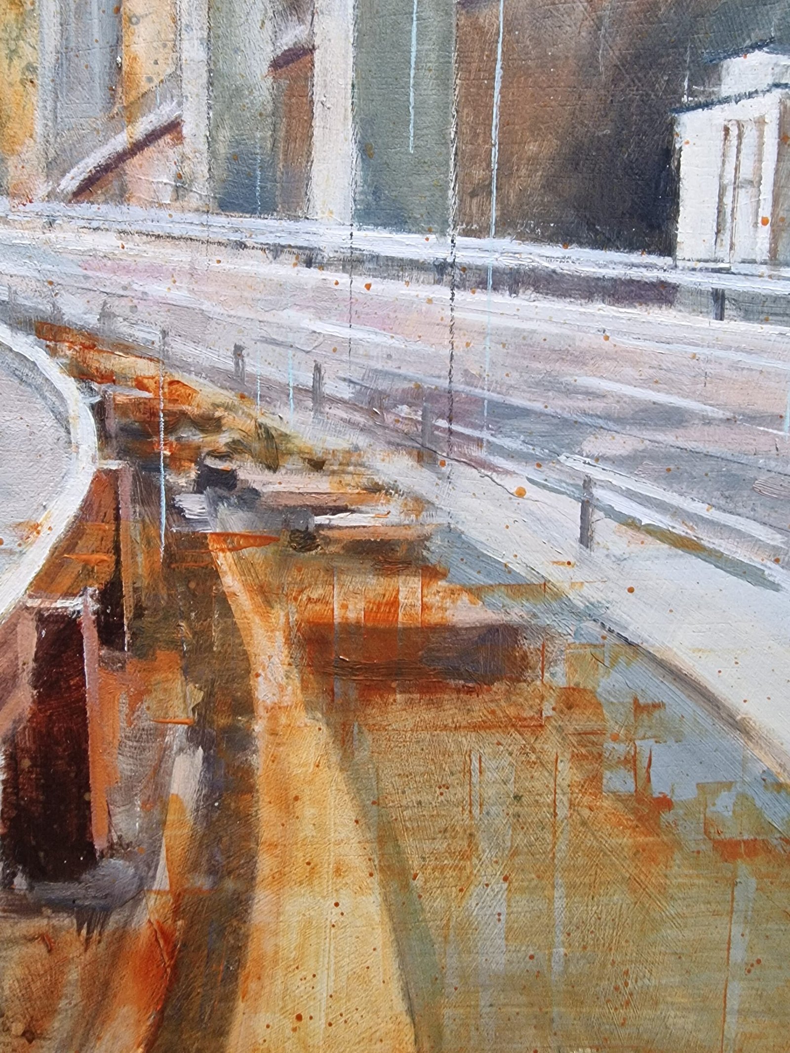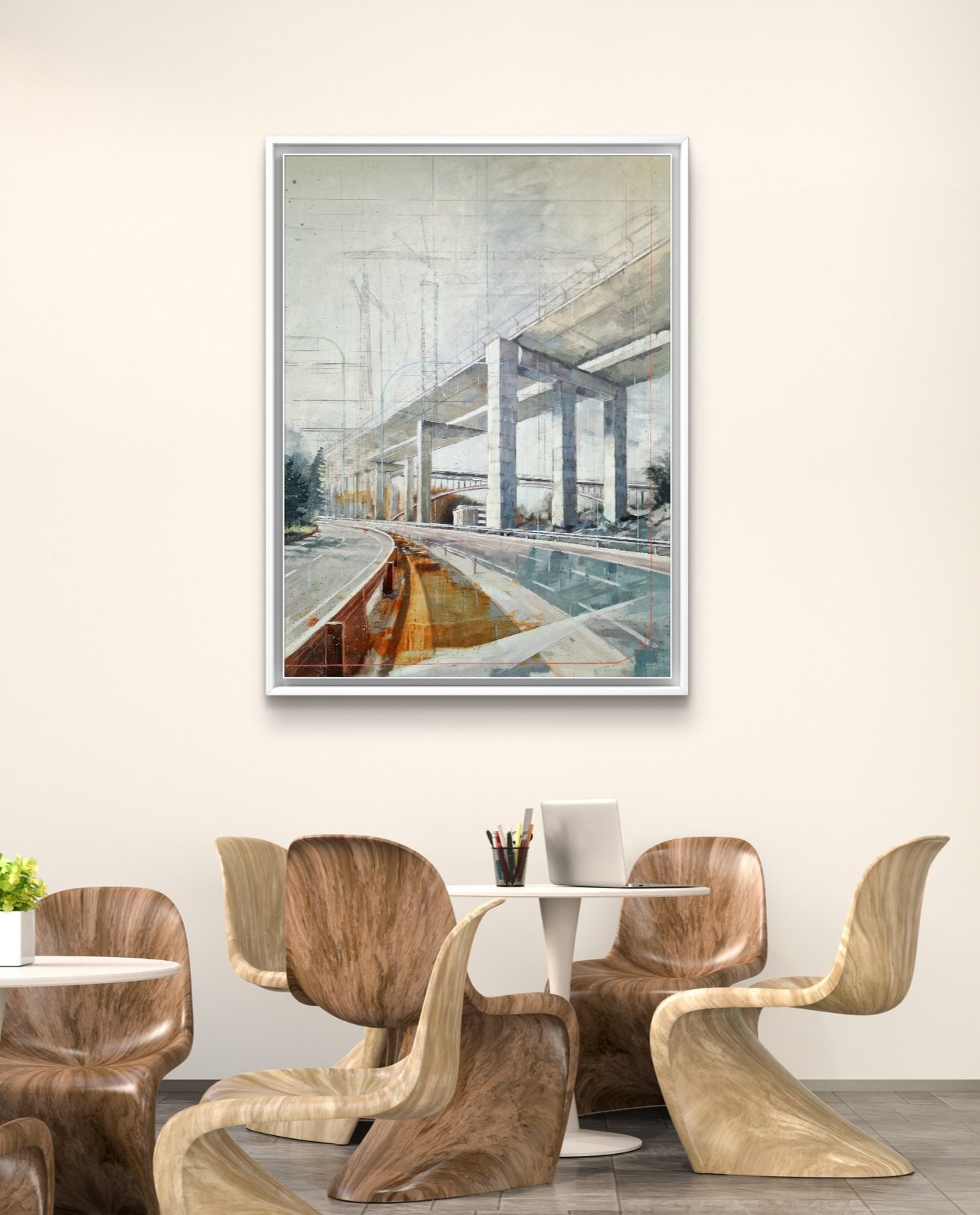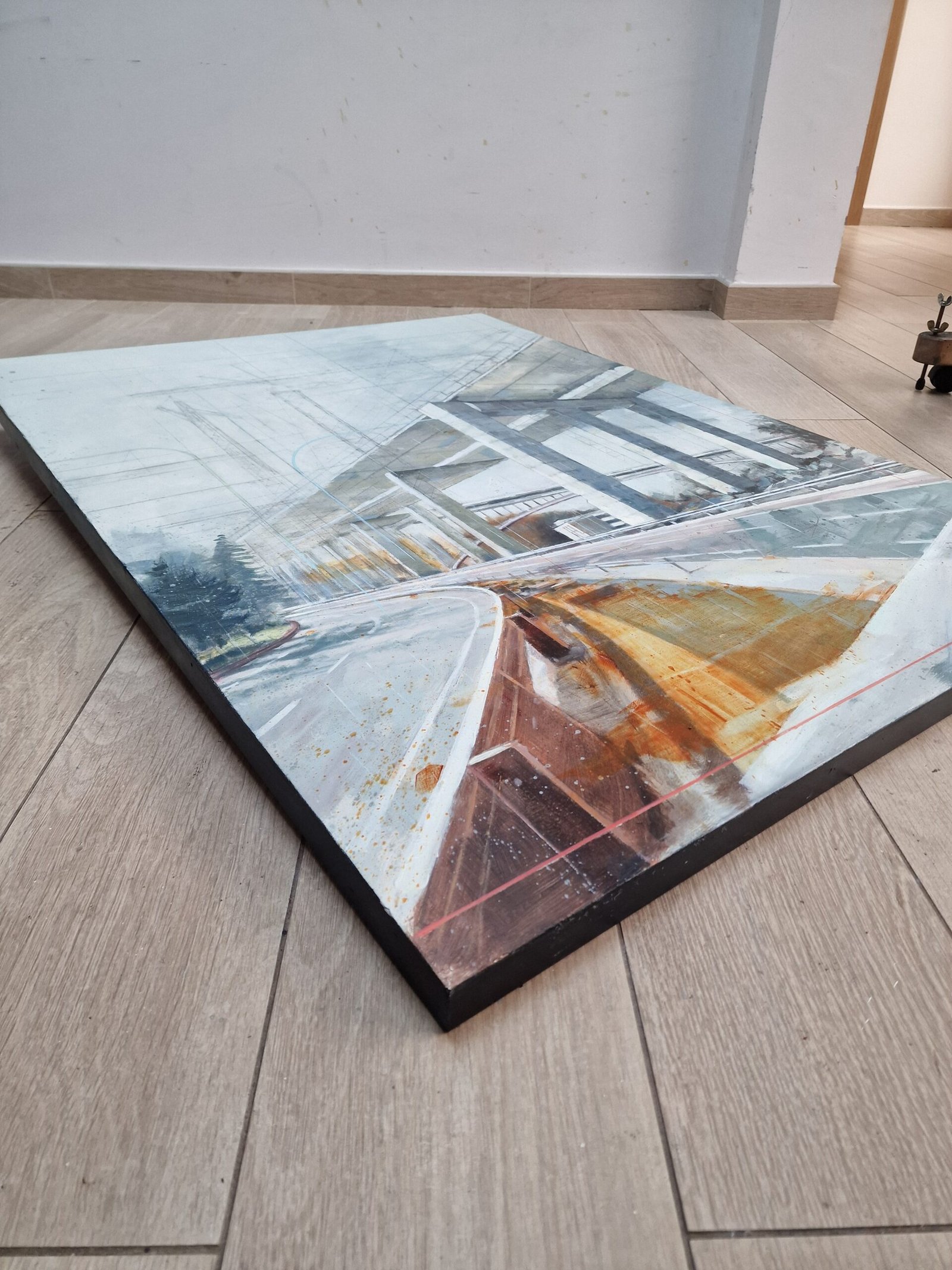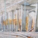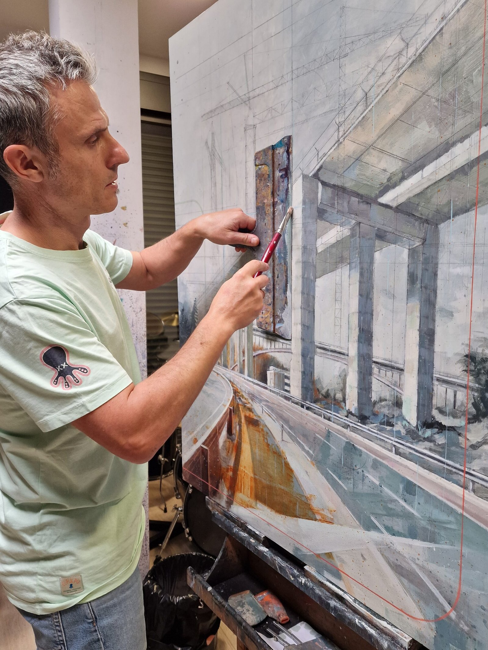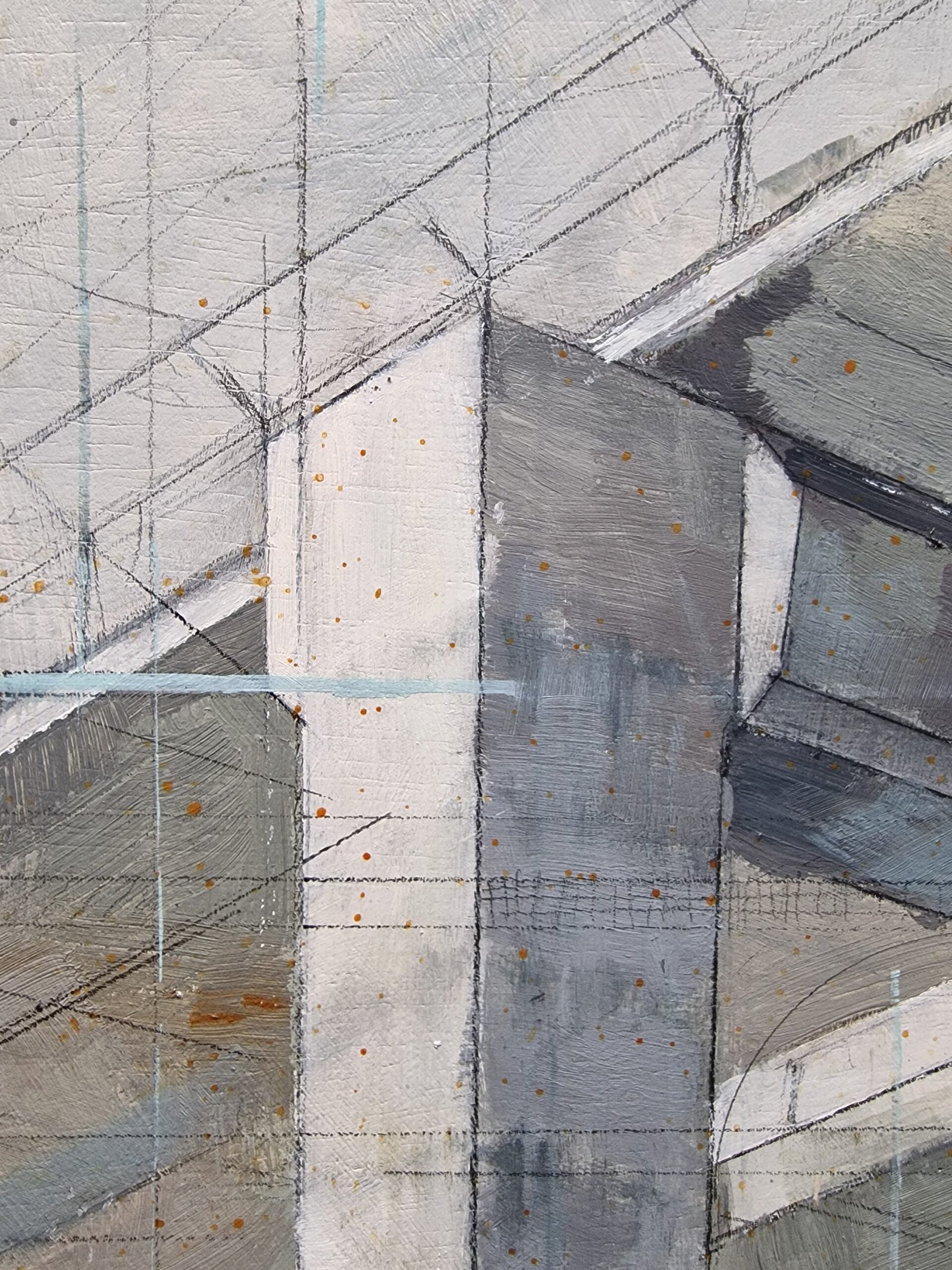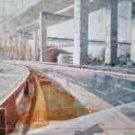 The abstract lines and ghostly cranes still visible in this image evoke that unfinished process, suspended between idea and reality, between desire and matter. The touches of rust and the cold shadows bring a serene melancholy—a blend of admiration and skepticism toward these symbols of progress and the human persistence that so often stumbles in its quest for lofty goals.