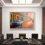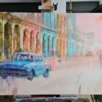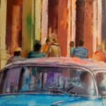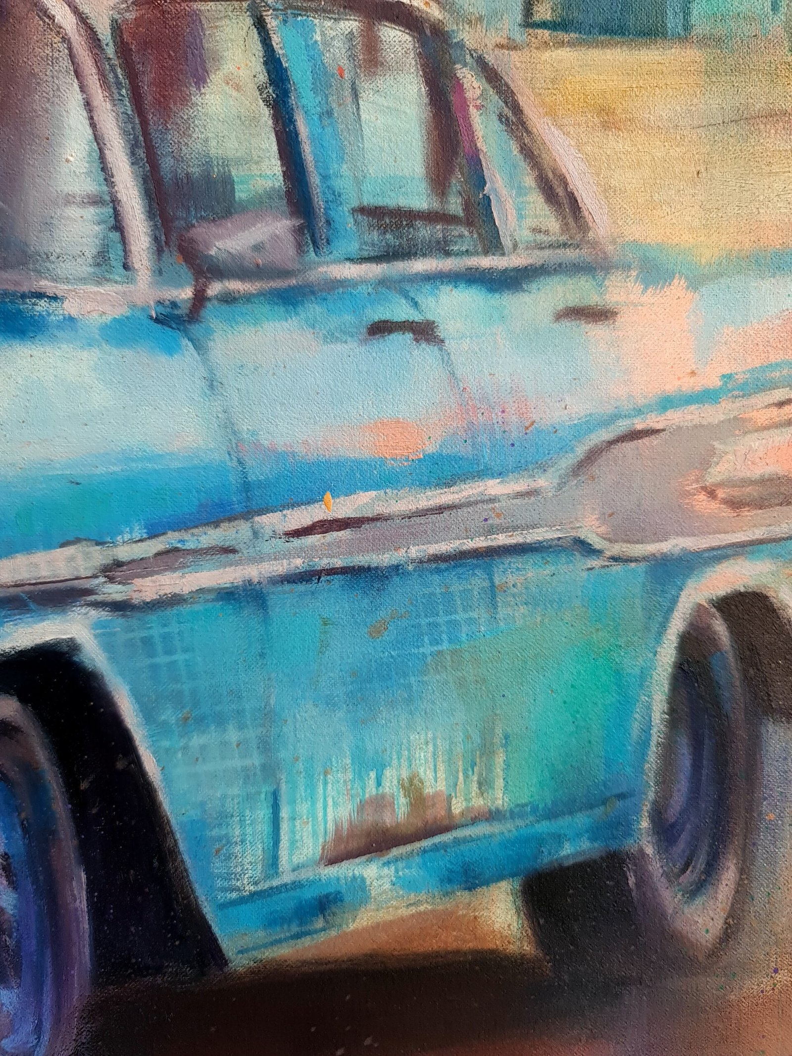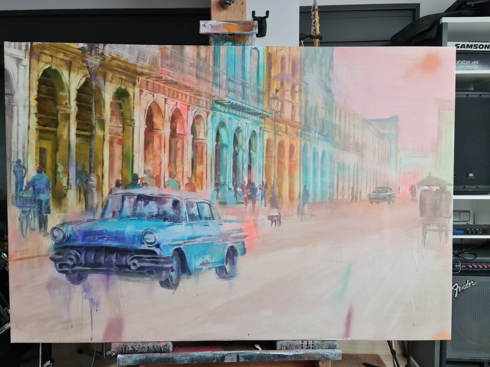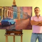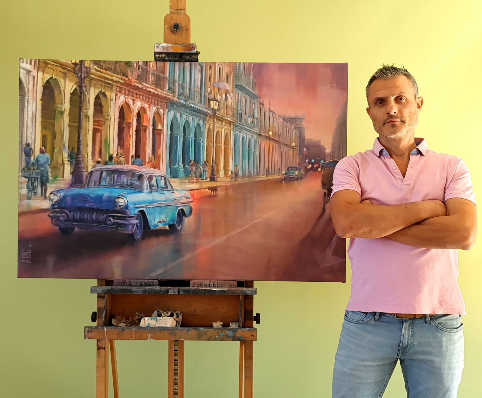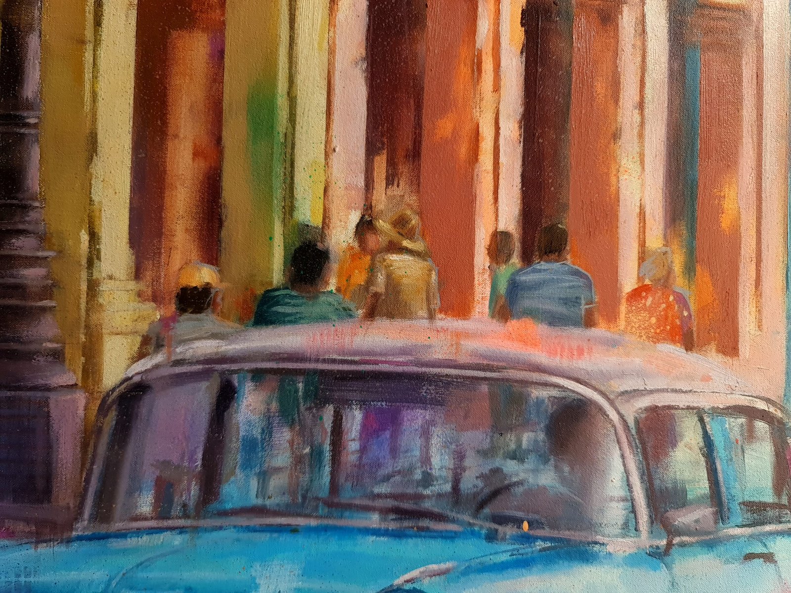 In “PASIÓN HABANERA” the life of the city is revealed through colors and elements characteristic of Cuba. American cars, lights, people walking, people selling fruit, clothes hanging on balconies… a passion for anyone who has visited Havana. This work is made with oil paint on canvas and framed with a wooden slat.