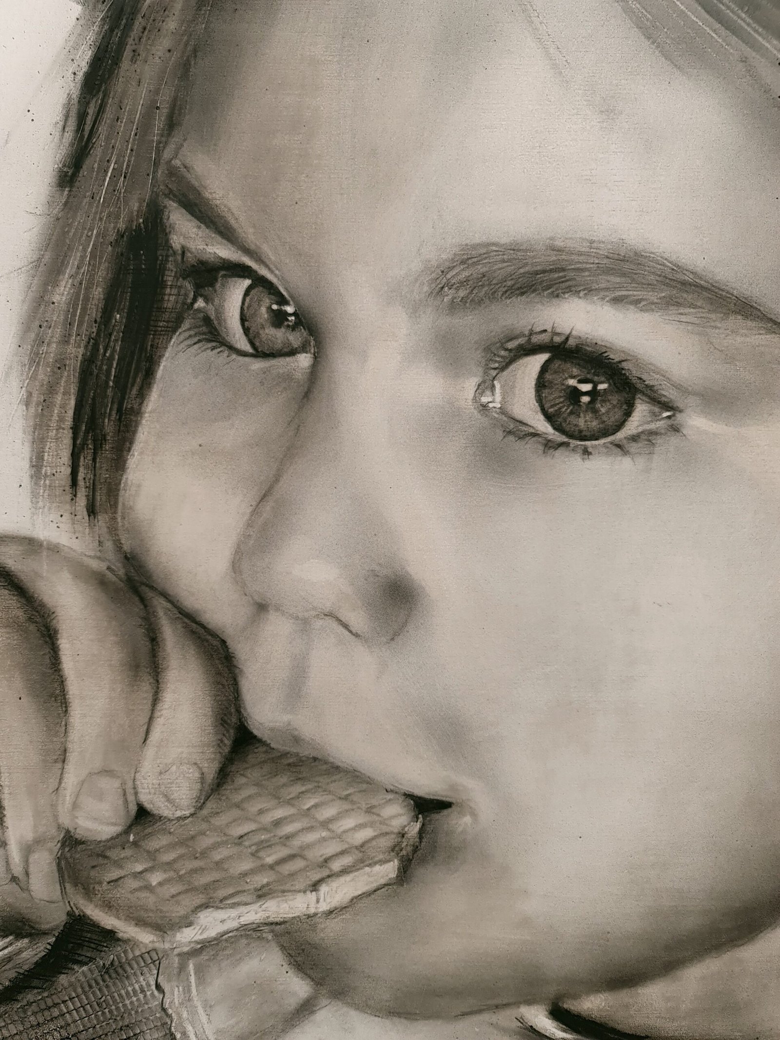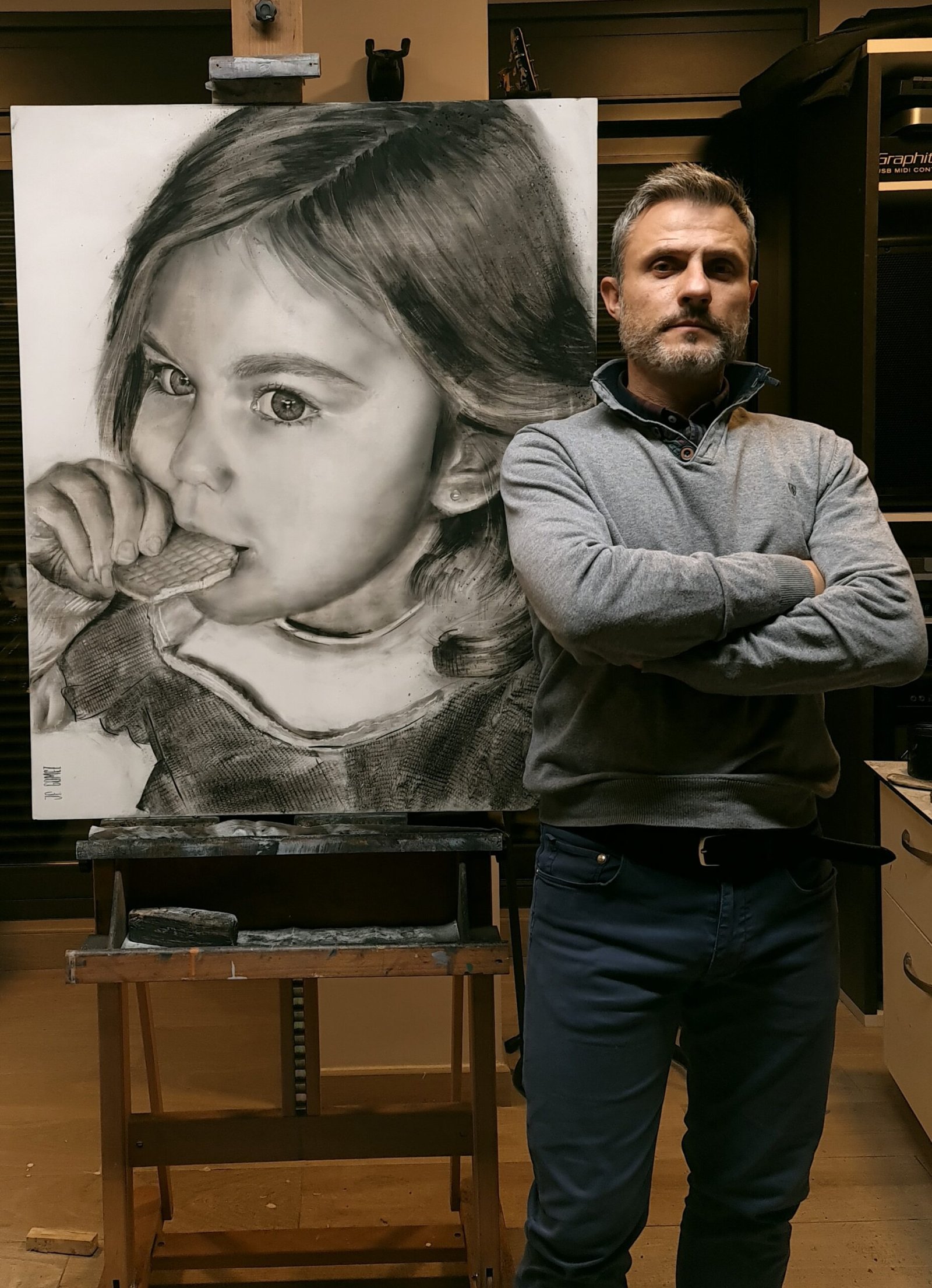 Cada retrato es un intento de capturar la esencia de ese momento único en el que no hacen falta palabras. Me encanta centrarme en el parecido físico, pero a la vez incluir esos rasgos personales que nos hacen únicos a cada uno de nosotros, todo ello rodeado de una atmósfera difusa, abstracta y etérea. Suelo jugar con la luz y la sombra, aprovechando todo el poder del carboncillo para añadir profundidad y realismo, dando vida a cada pliegue, a cada gesto.