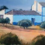This piece captures the essence of the Navaseca Lagoon, a unique natural space located in Daimiel, which serves as a refuge for countless migratory birds. A serene and evocative scene that reflects the surroundings with an almost poetic clarity. The landscape is dominated by a farmhouse painted in shades of blue and white, standing out in the middle of the dry field and surrounded by small trees that bring balance and life to the composition. The calm atmosphere and clear sky reveal the sunset in this Manchegan space, where the soft light enhances the textures of the field and the sounds of the birds.
