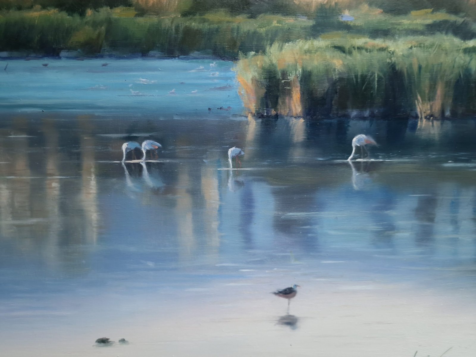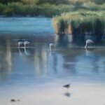 The water becomes a natural mirror that reflects the flamingos, adding dynamism and delicacy to the scene. These birds, with their long legs and elegant postures, add a touch of life and moving nature to the tranquility of the landscape. The combination of the blue tones of the water and the shadows on the field creates a harmonious contrast with the warm colors of the earth.