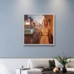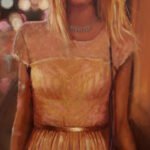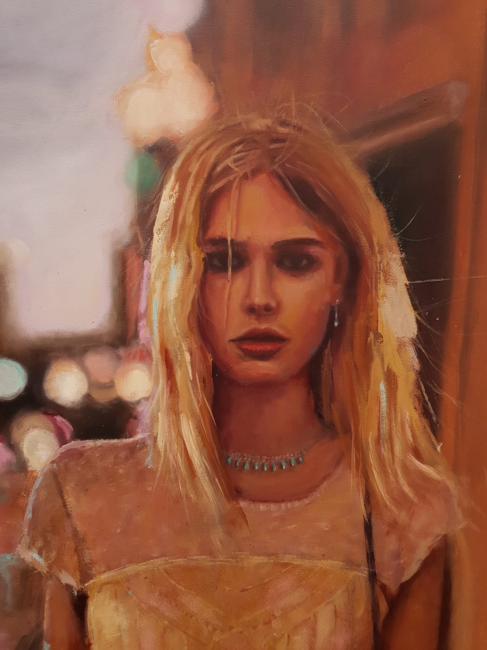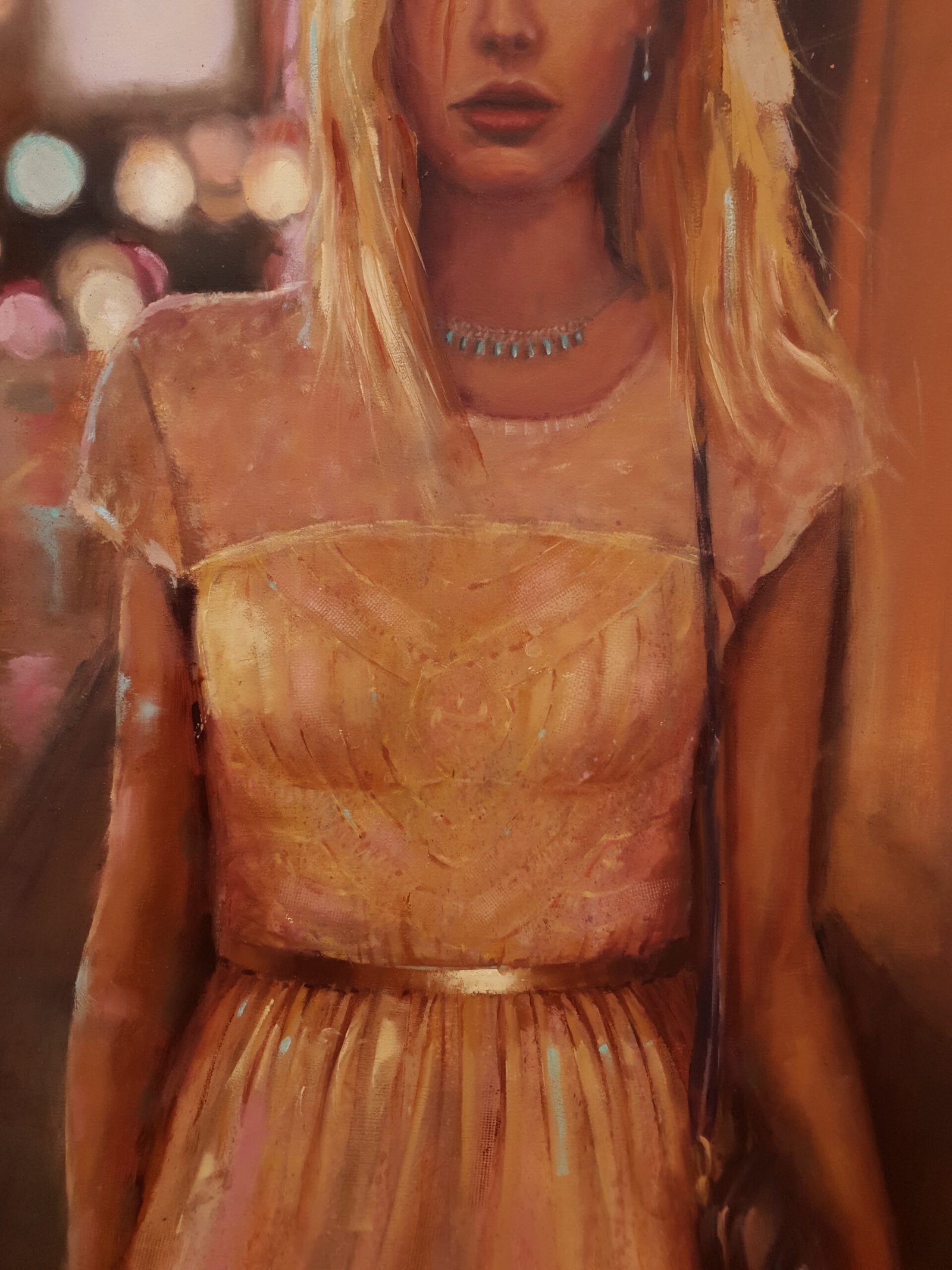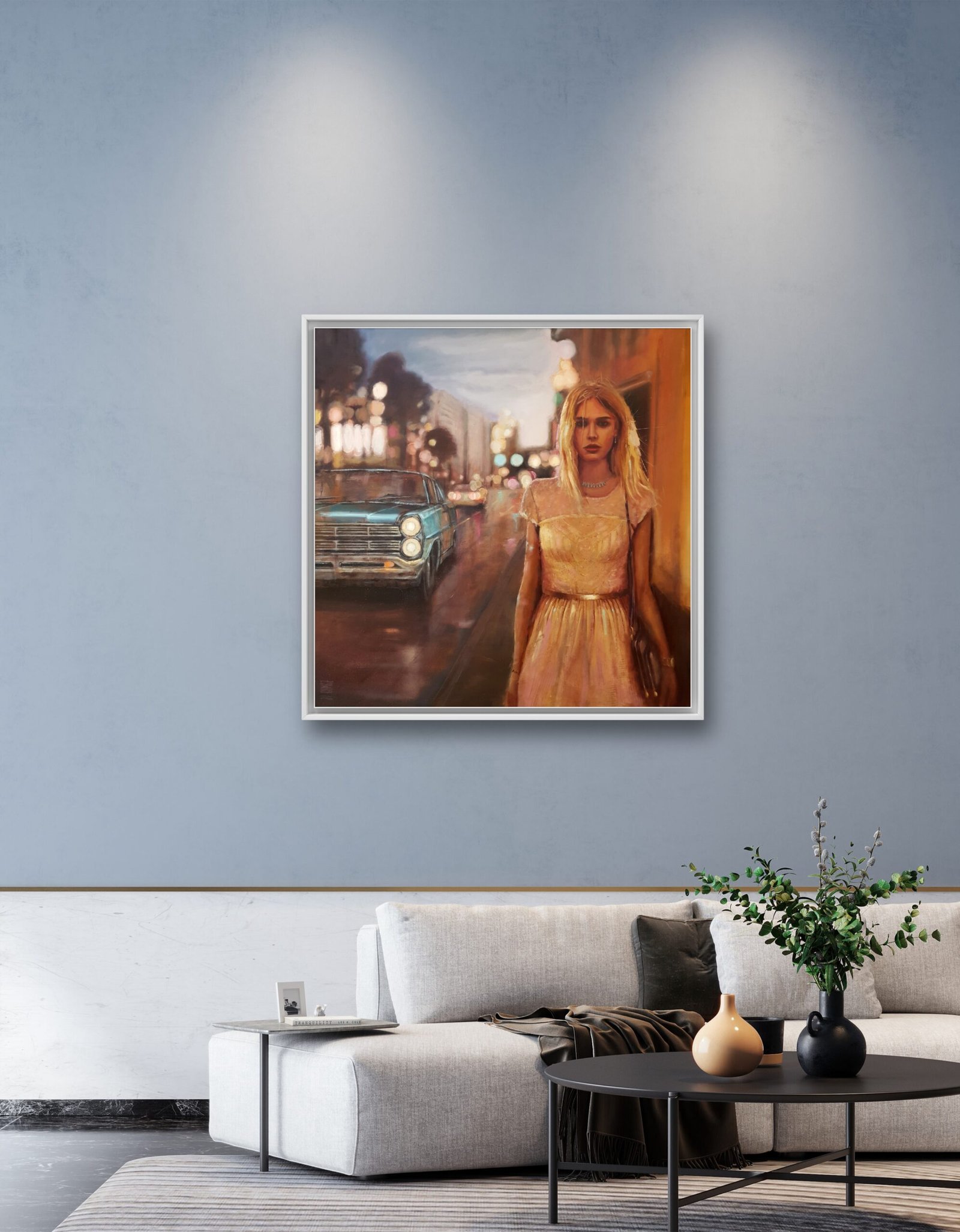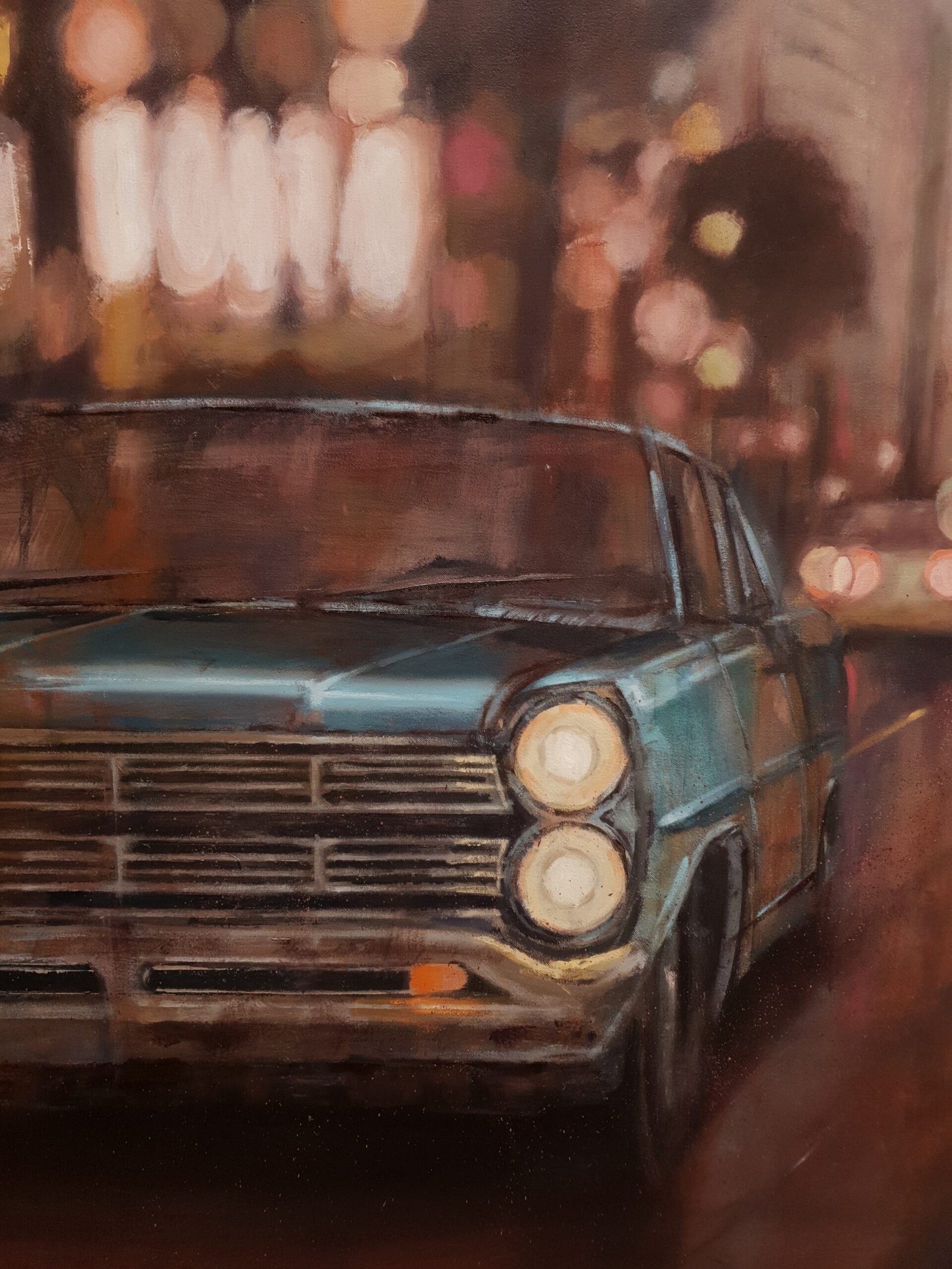 In Luces de noche II all this comes to light. The painting is made manifest through an evocative 1965 Ford Galaxie that appears in the background, next to a girl who walks determinedly forward, in search of a hug, a kiss, the enjoyment of friends or the warmth of a pub. The yellow of the nearby streetlights envelops the entire work while the lights of the traffic lights, the illuminated signs and the lights of the cars, with their flashes, tint the shiny fabric of the dress and the reflections in the hair. This work is executed with oil on canvas and framed with a wooden slat.