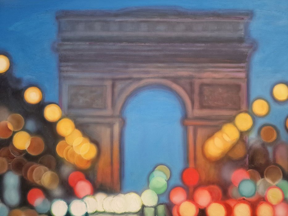 Several minutes have passed since the sunset. The warm, golden hues have shifted to the deep blue that greets the night. In the distance, the Arch of Triumph stands tall, guarding the city, reminding that it has dominated the scene for many sunsets.