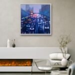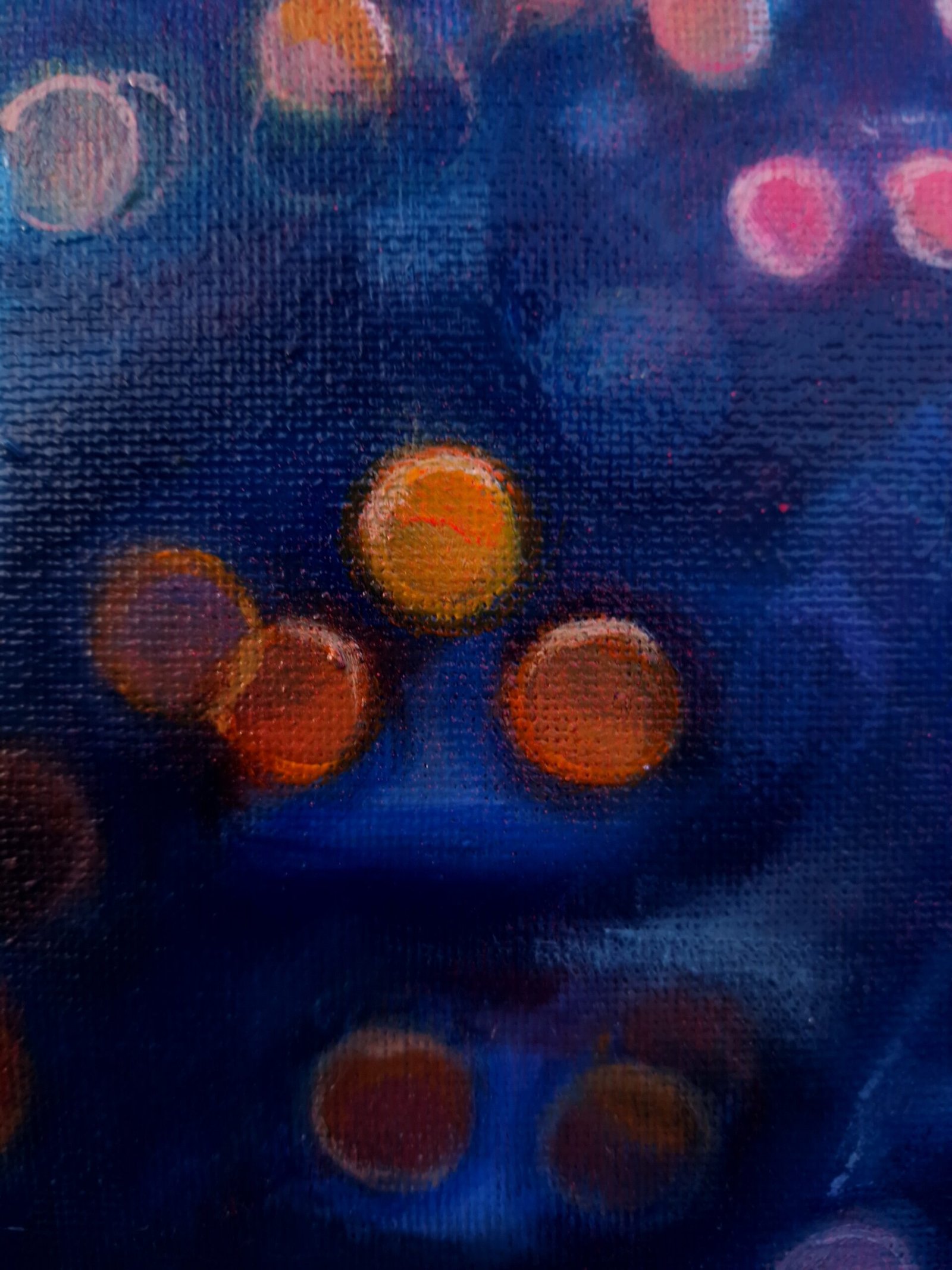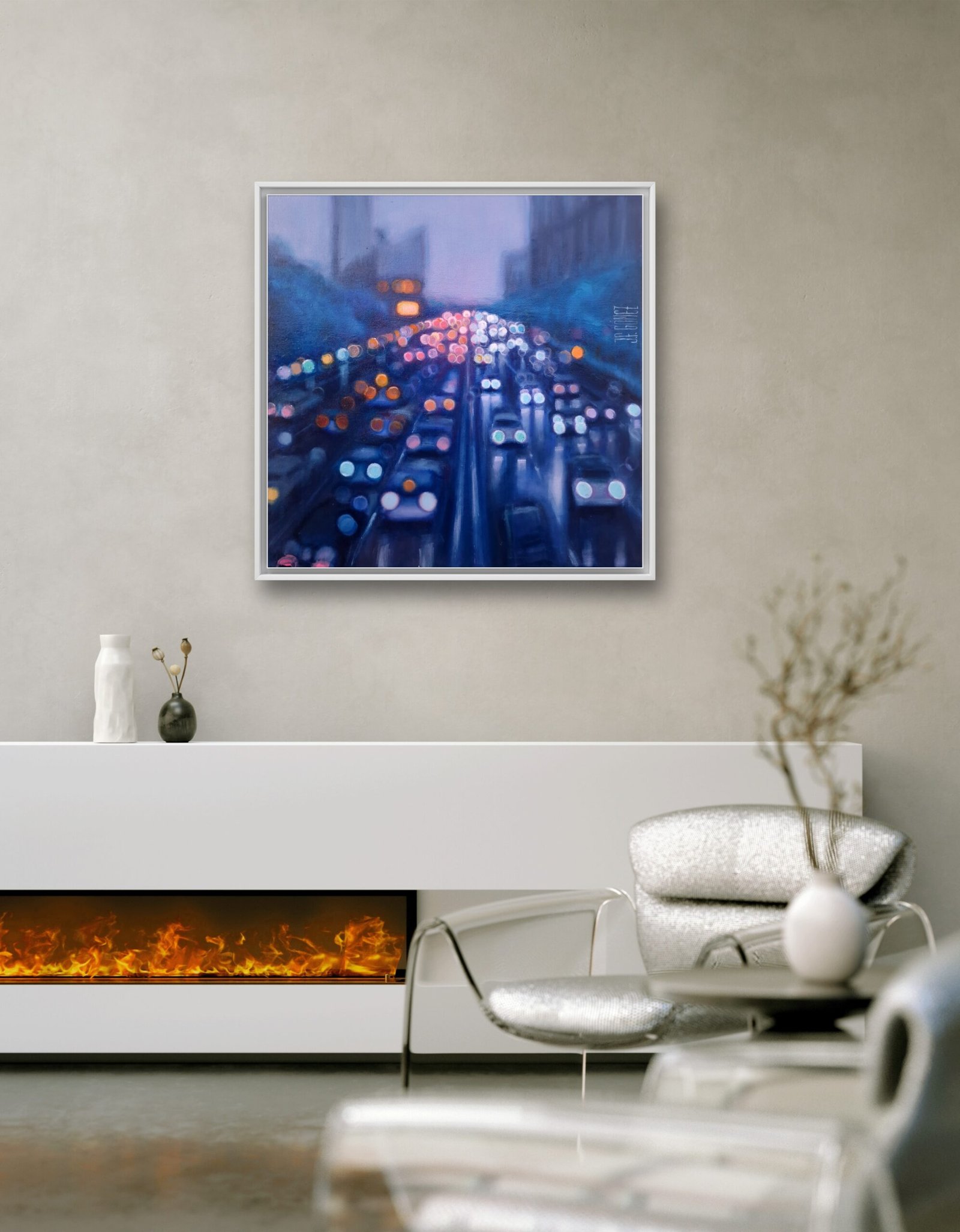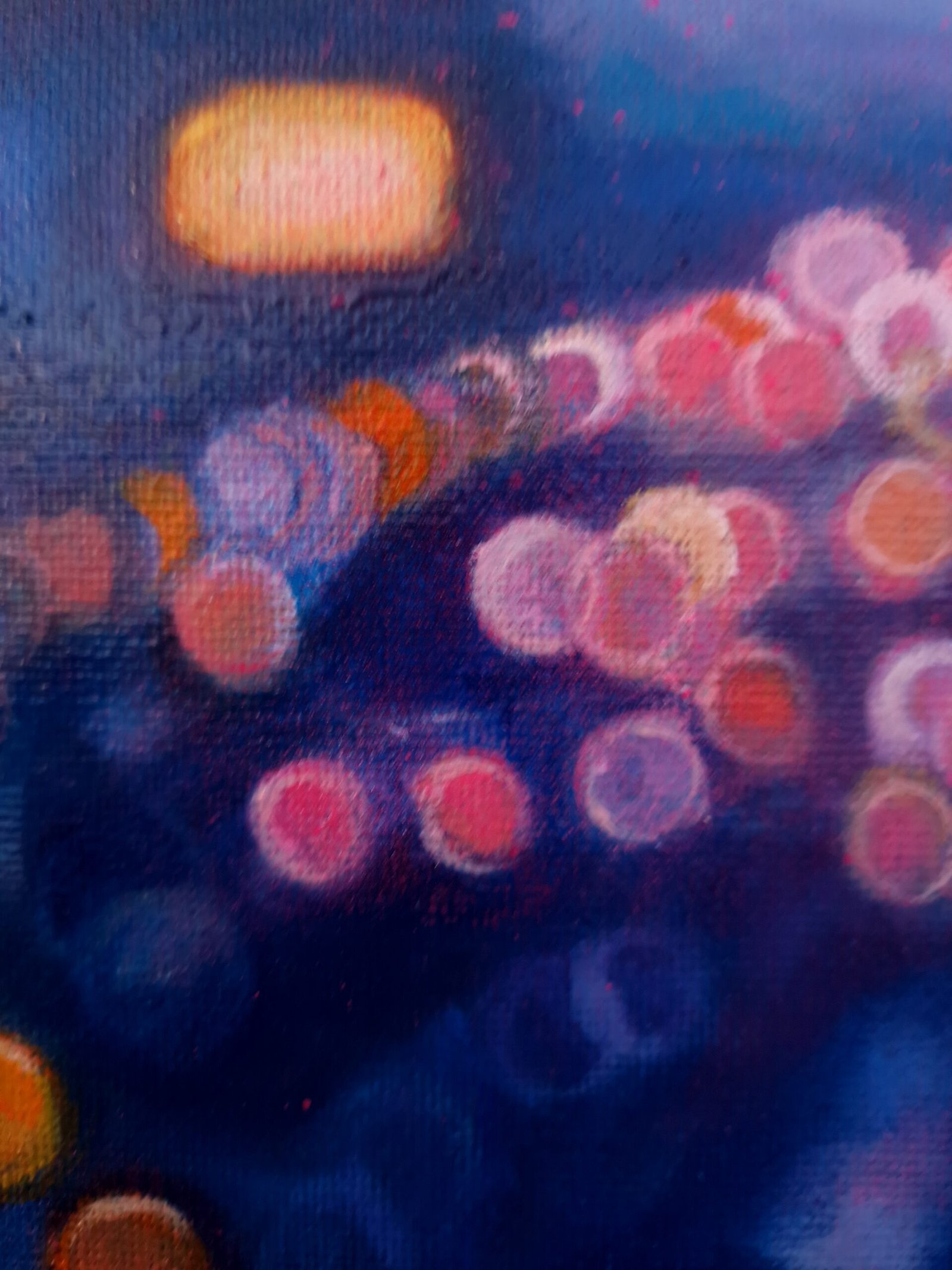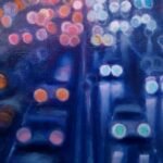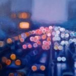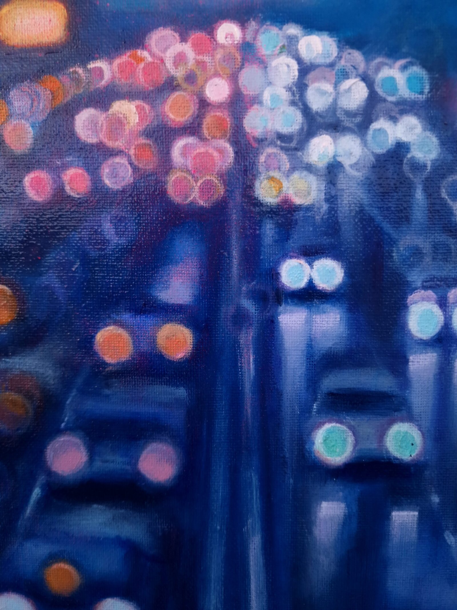 This work is part of the series "Urban Nights" that includes, among others, paintings that portray the night in the cities. Seeing how the cars come and go incessantly and chaotically and how the darkness hides our fears and insecurities while the lights swallow up the night seems really interesting to me. The reflections of the cars show the unbridled activity of the city, fast and beautiful, like life itself. Up close it seems like an almost abstract landscape, but when you take a step back... the work emerges.