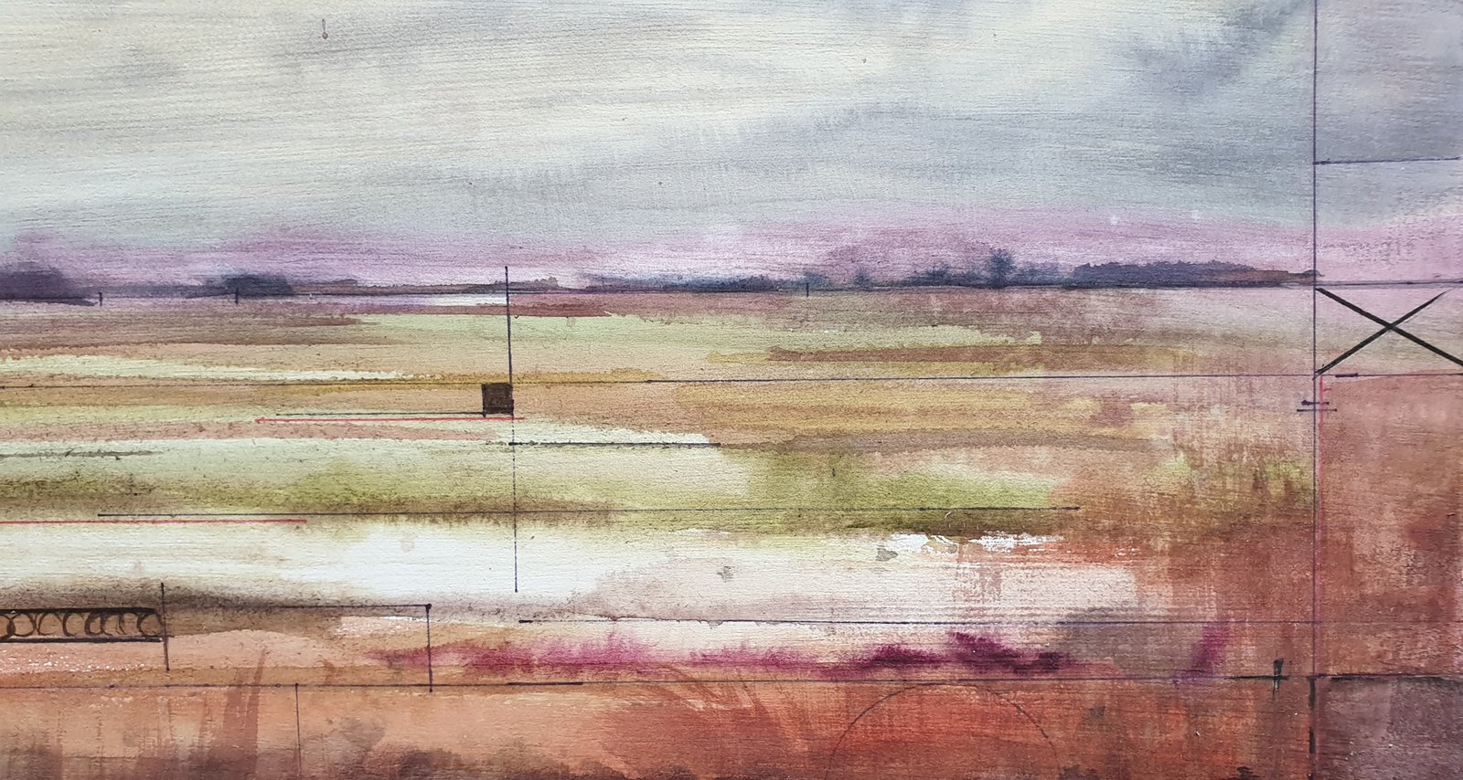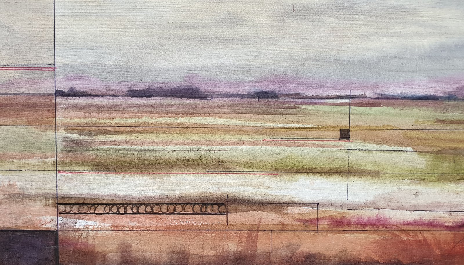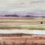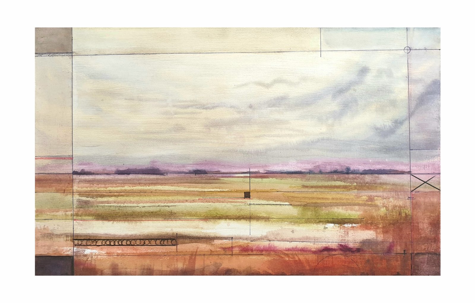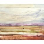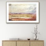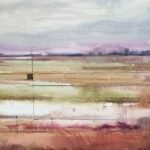 I wanted to capture the serenity of an autumn landscape after the rain. Soft tones of oranges and grays blend into a hazy atmosphere, as if the water had left a veil over the land. The geometric lines are intentional; they suggest a hidden order beneath the surface but don’t disrupt the softness of the color. An abstract landscape, a scene felt more than seen. It’s an invitation to observe and feel the calm of an open space, to be carried away by the peace it conveys and get lost in its softness.