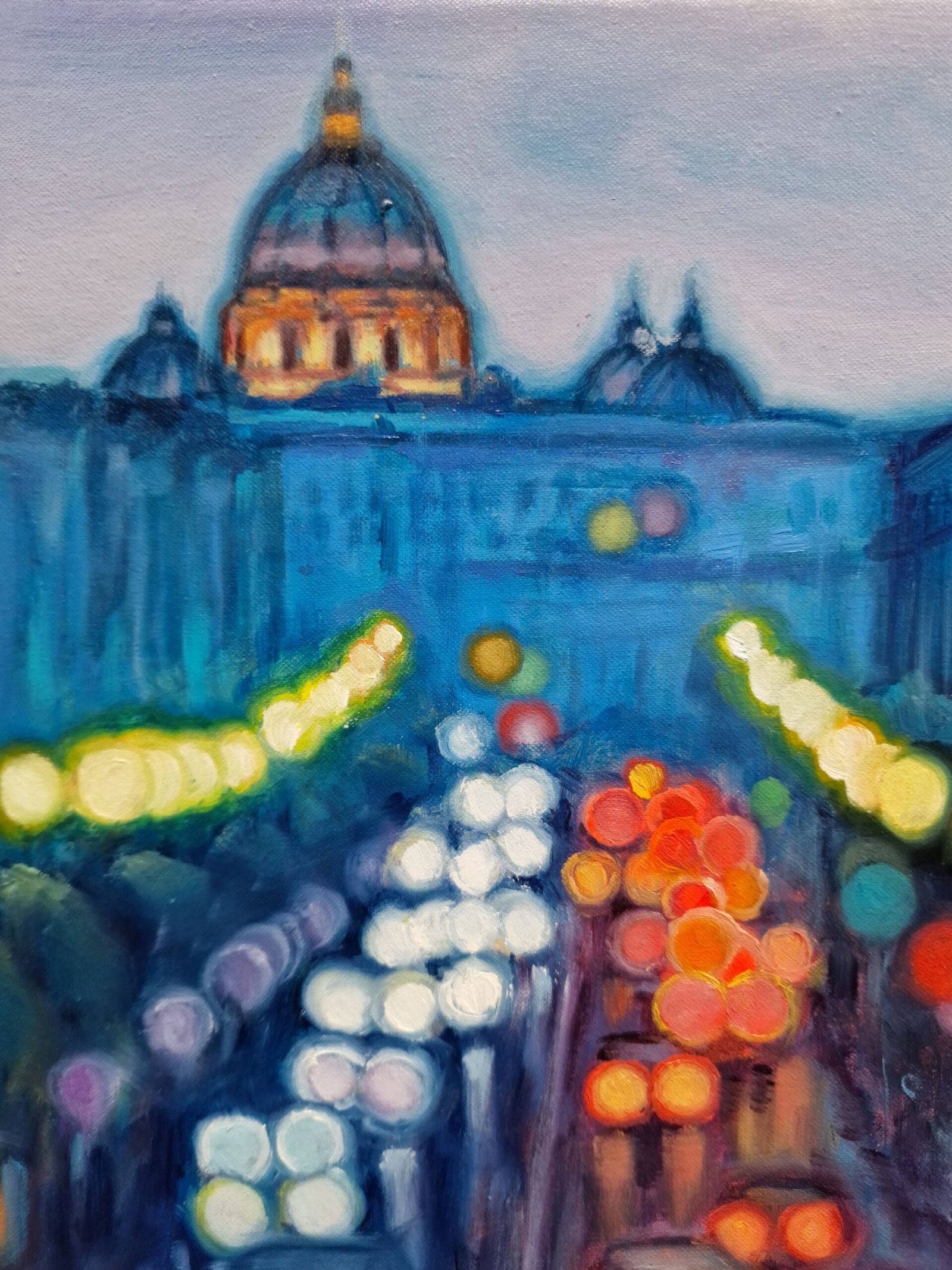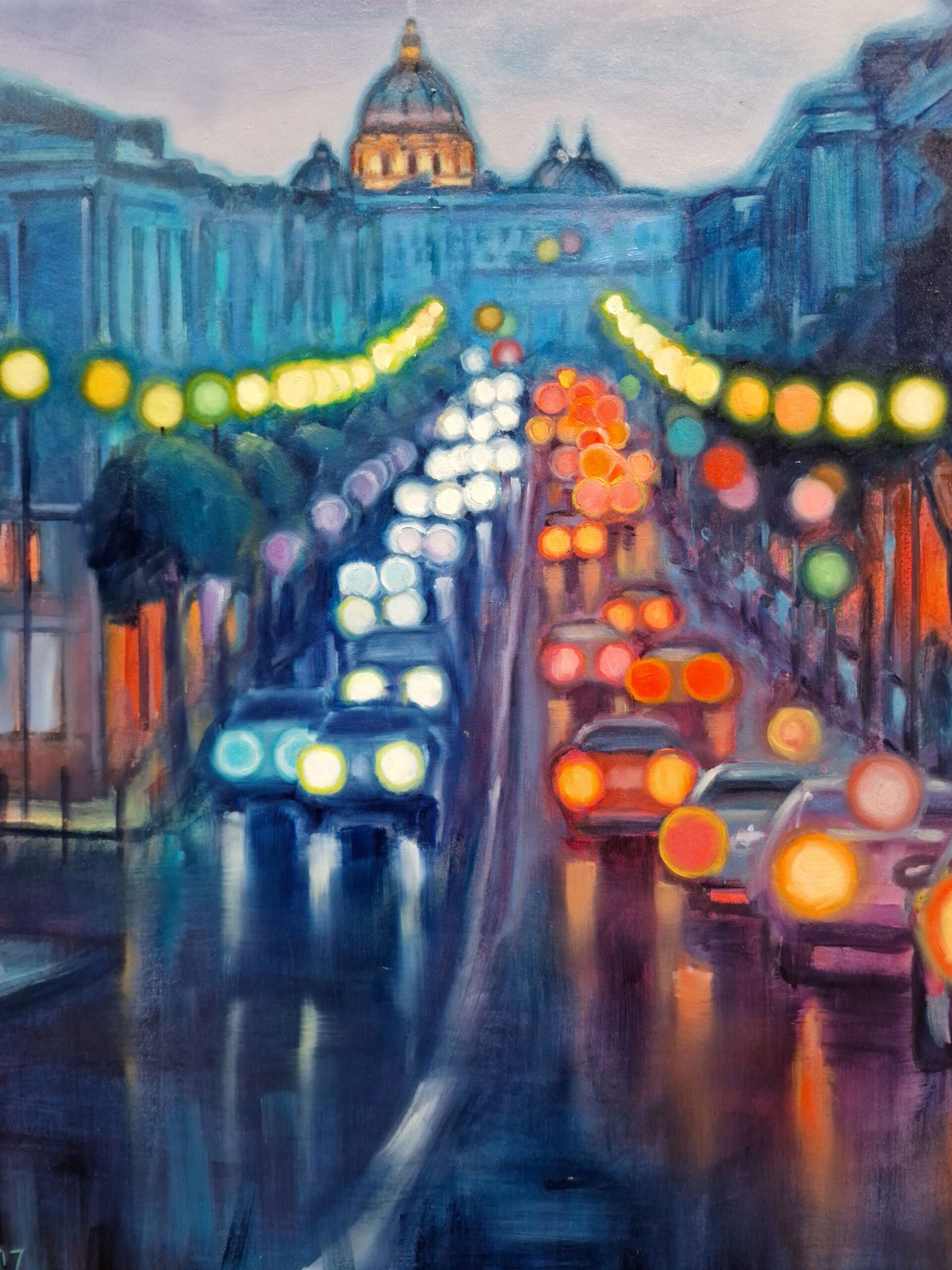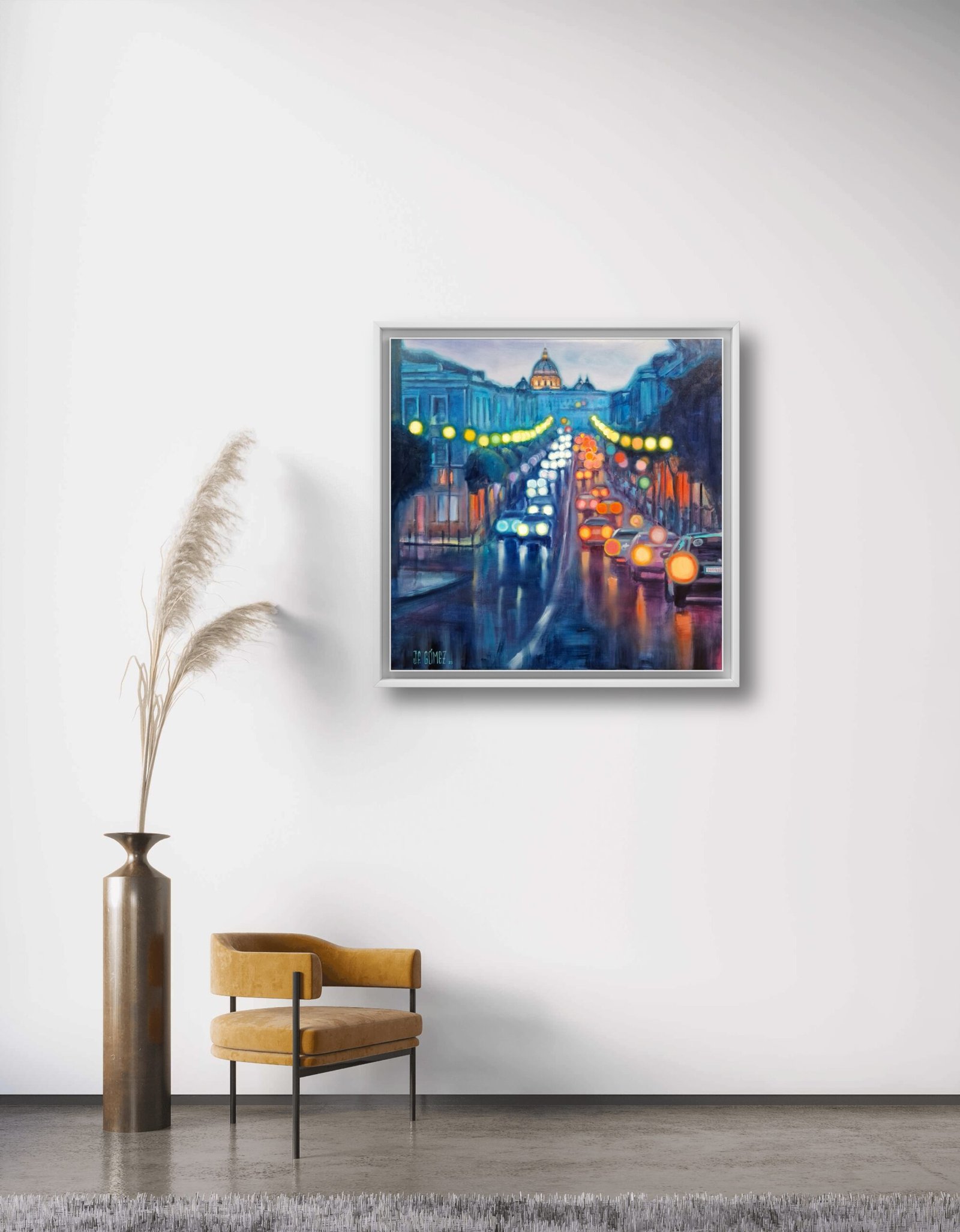 I like to capture the vibrant essence of urban life, the flow of its lights, its shadows. The transformation of people forgetting their fears and setting out to walk the streets. All of this comes together to create modern atmospheres, of cities full of life and excitement. On the canvas, the city pulsates with energy; cars and lights mix in a dance of colors and shapes.