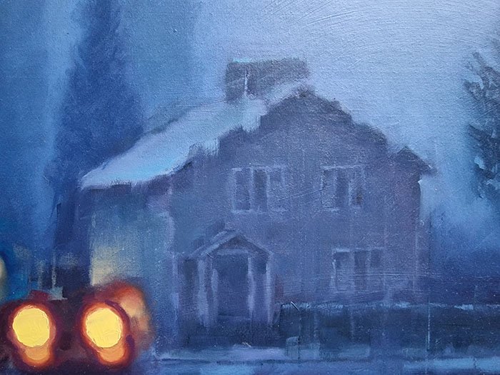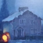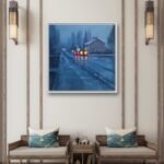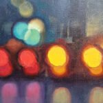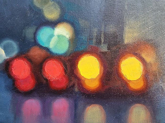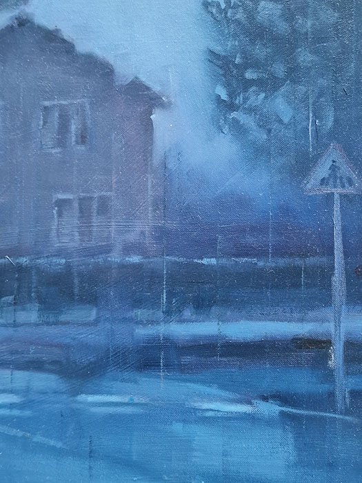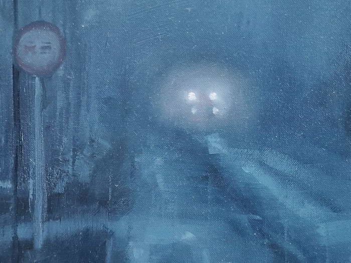 In this piece, warmth appears unexpectedly as we observe the car lights heading home. Amidst a cold landscape, we feel a certain warmth and great peace. The colors play a role in this too. Blue connects with the cold and brings us that tranquility, while the car lights ignite a flame within us that gives us warmth. Without a doubt, it’s a mysterious and special piece that will evoke memories. It belongs to the Urban Nights series, primarily paintings that depict the night and explore its relationship with surroundings and people. The night brings out those wishes and dreams that lie dormant during the day.