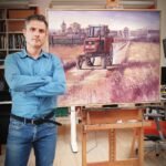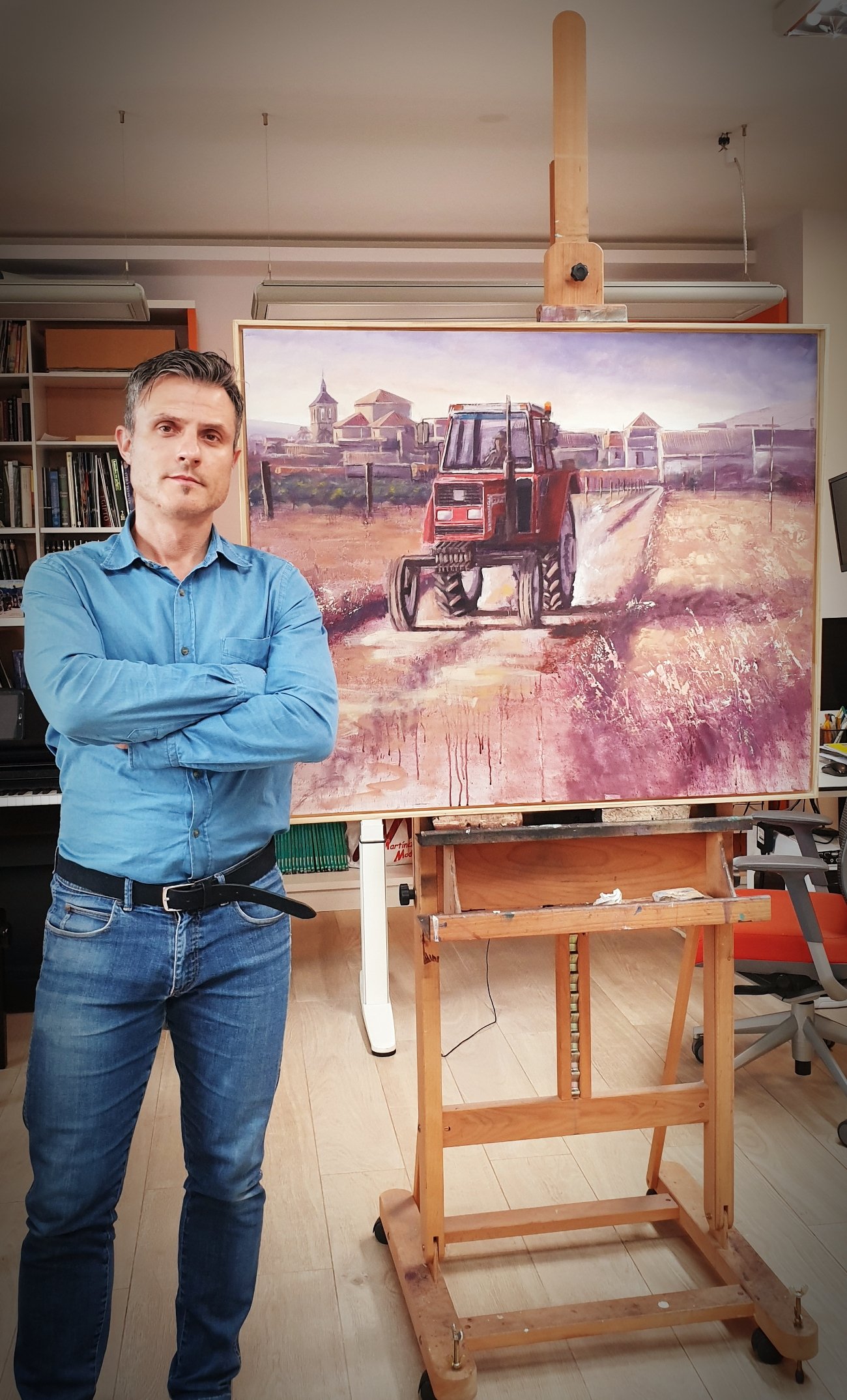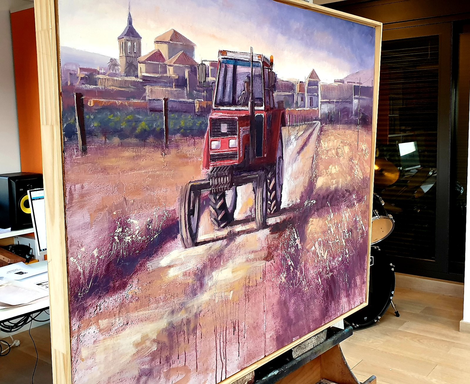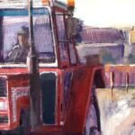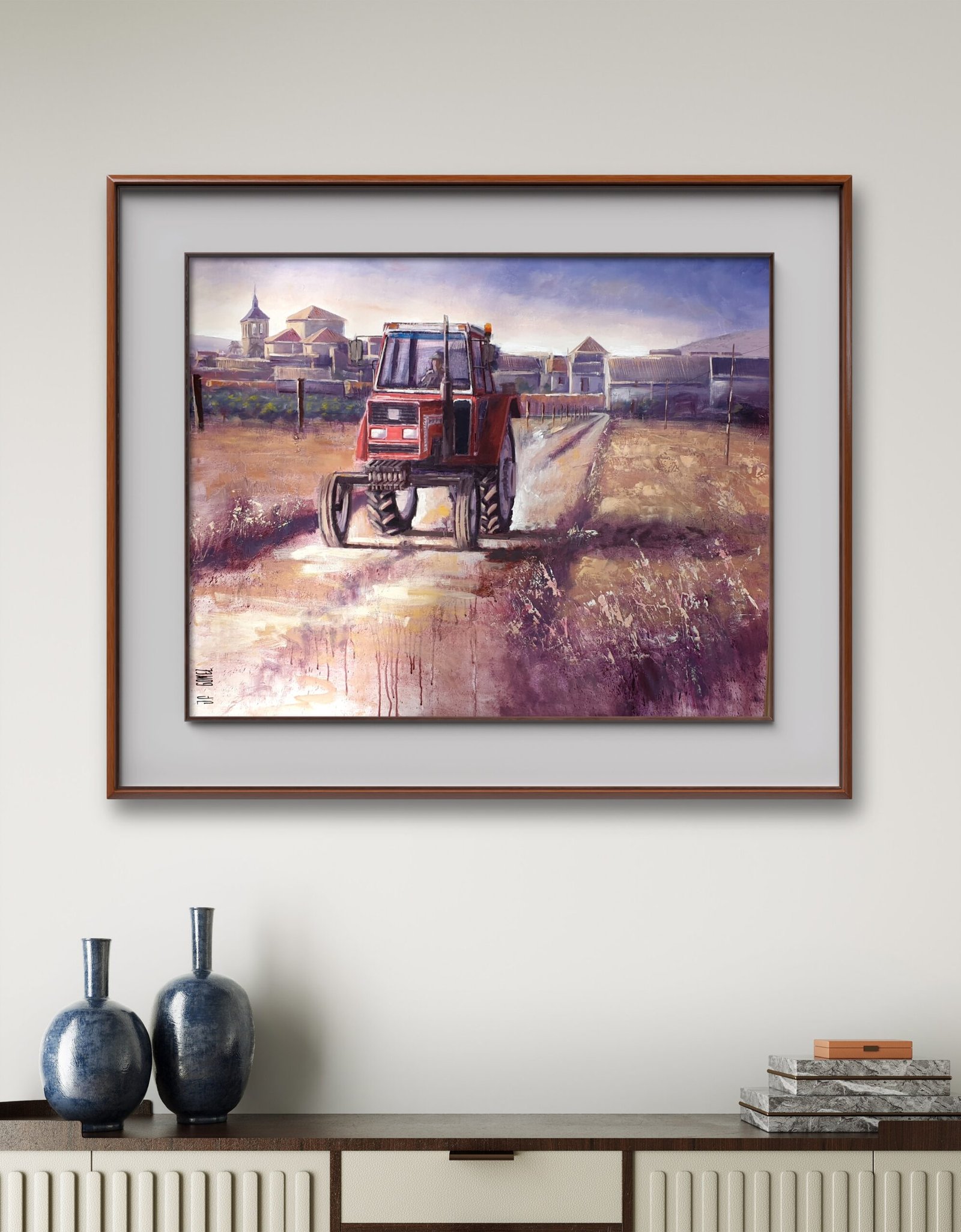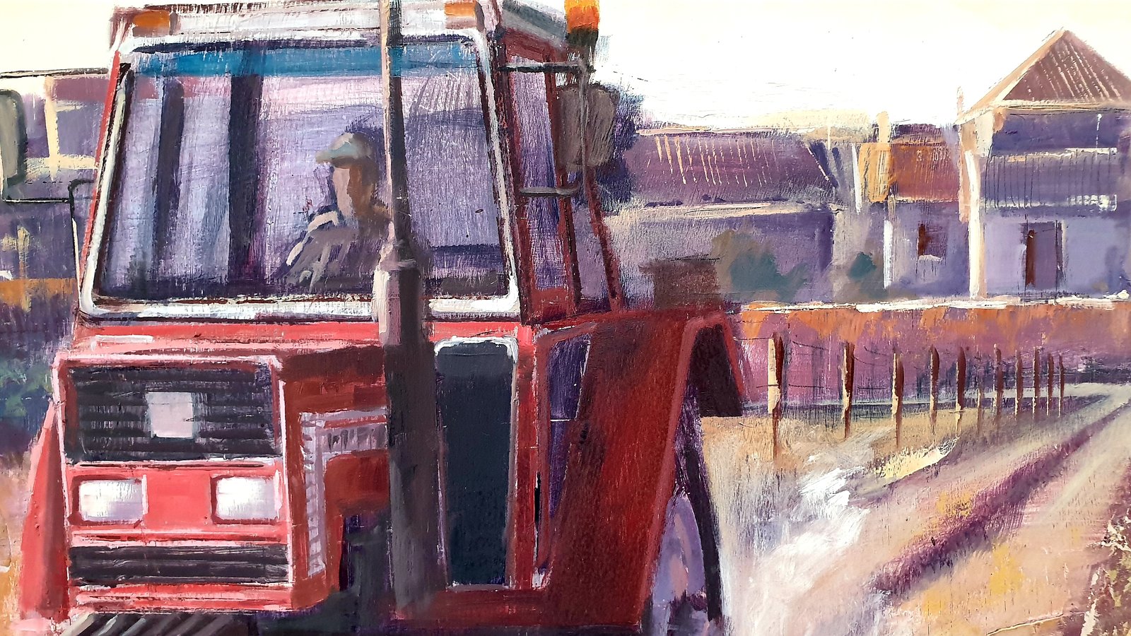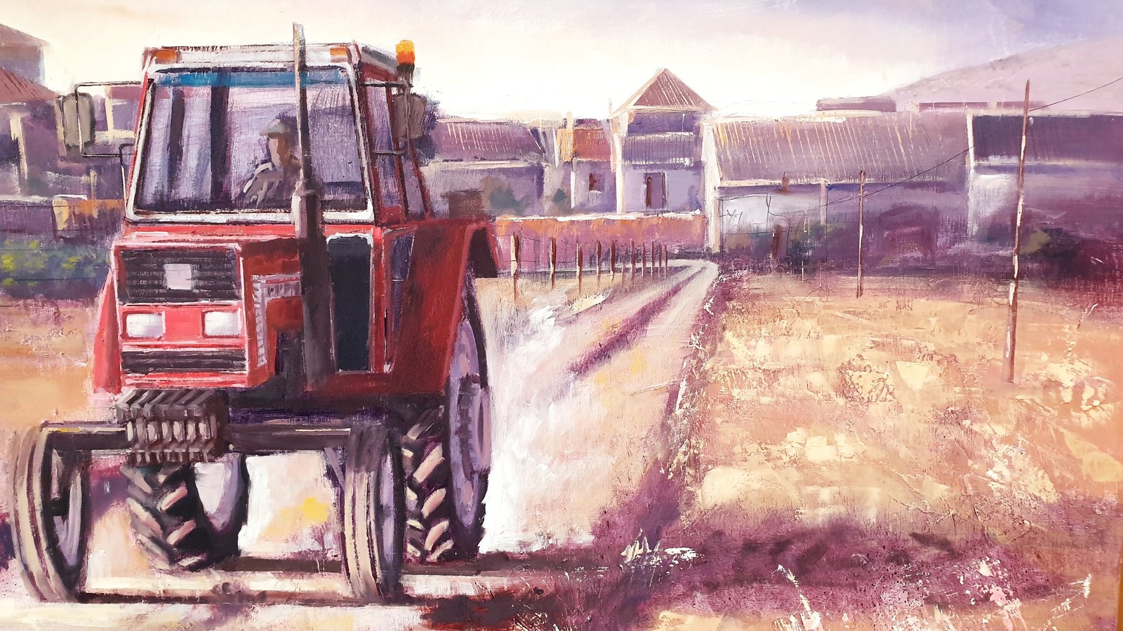 This painting captures the essence of rural life, highlighting the daily labor and resilience found in agricultural communities. At the center of the composition, a red tractor moves steadily along a dirt path, its presence symbolizing hard work and the connection between humans and the land. The background reveals a small village, with traditional buildings and a church tower, set against a soft, warm sky that suggests either dawn or dusk.