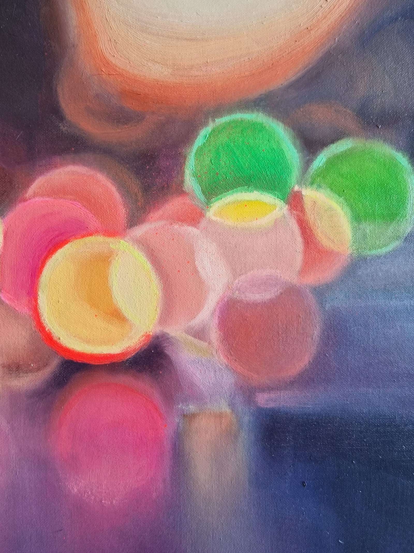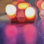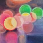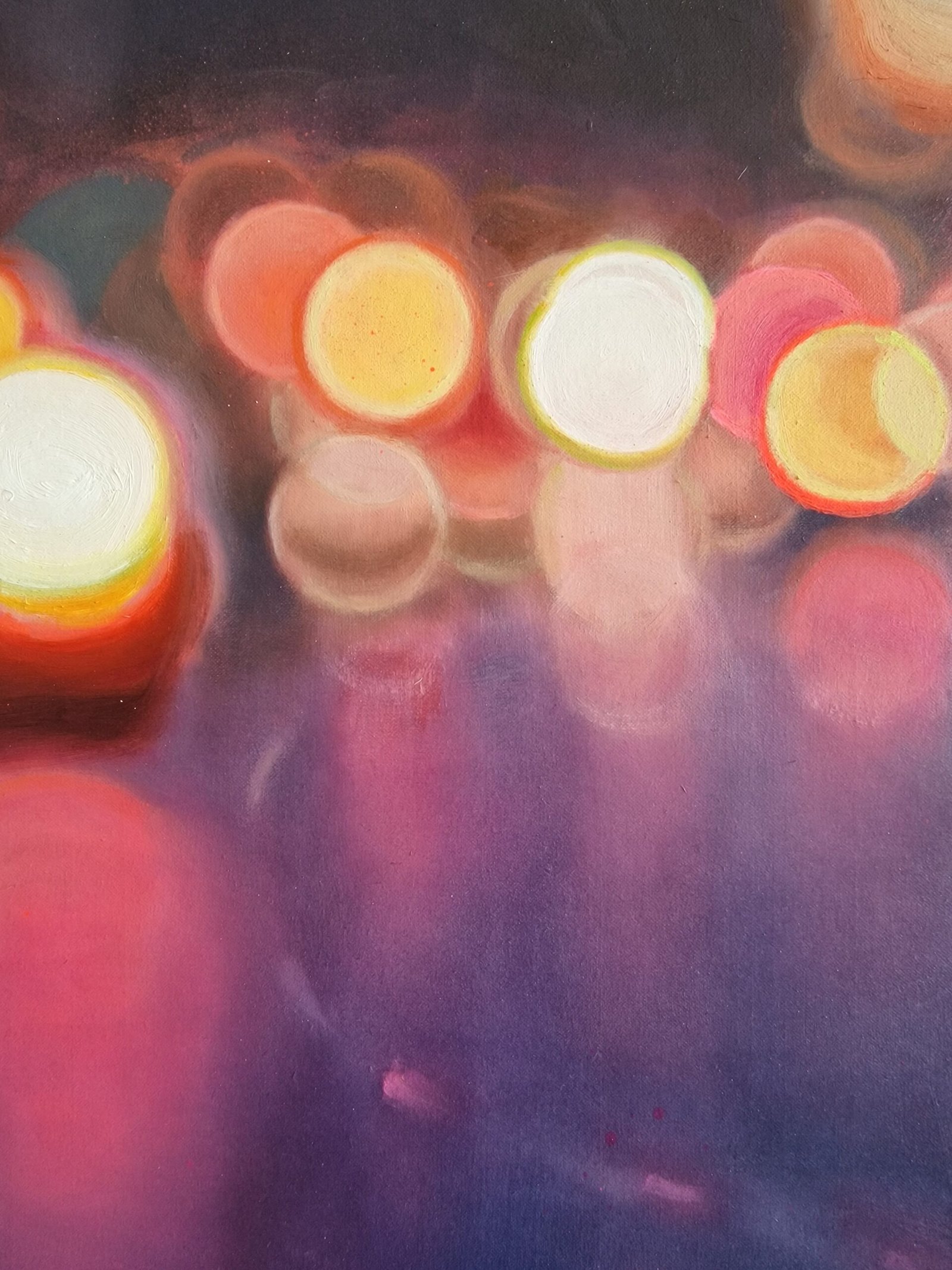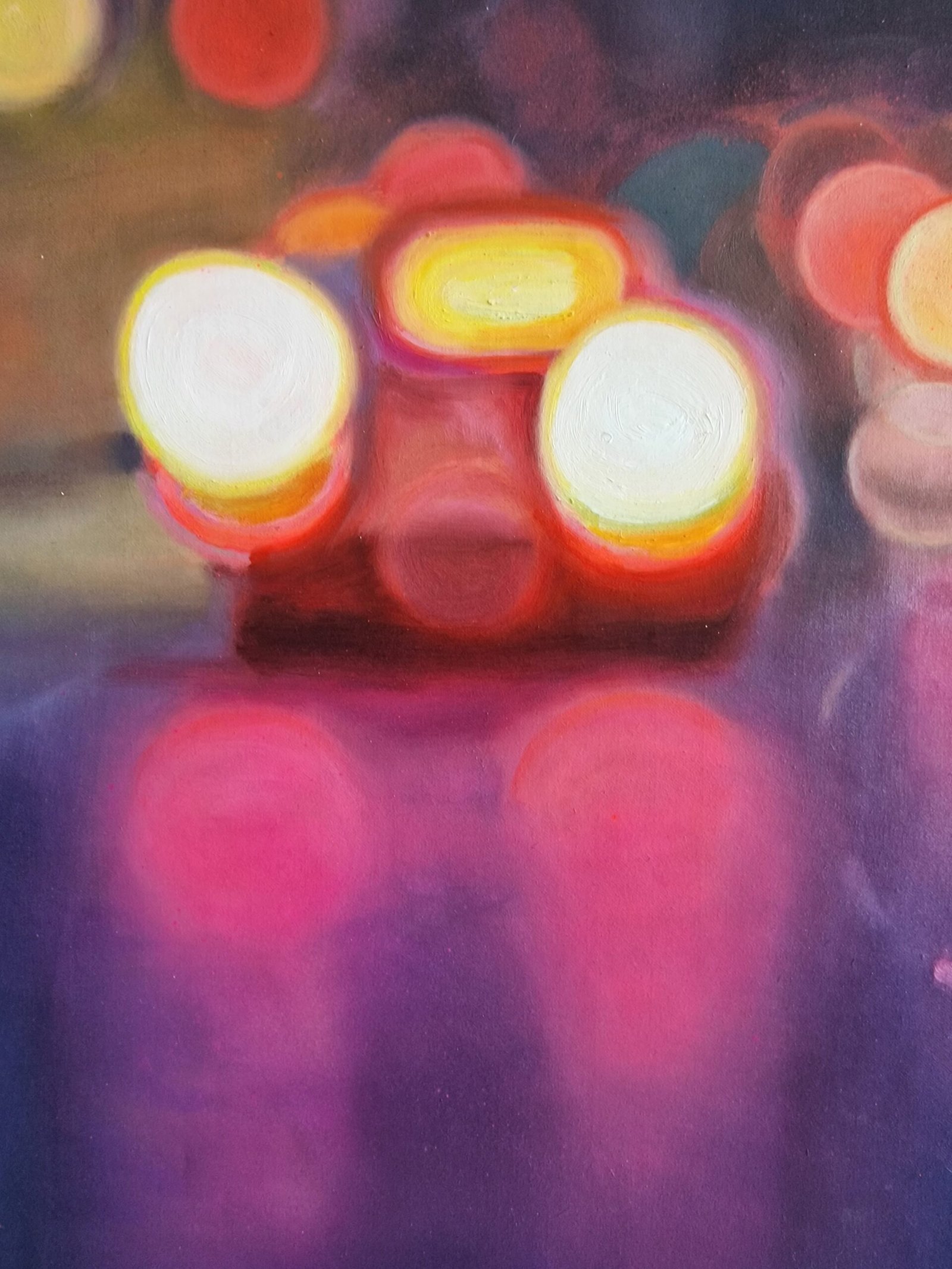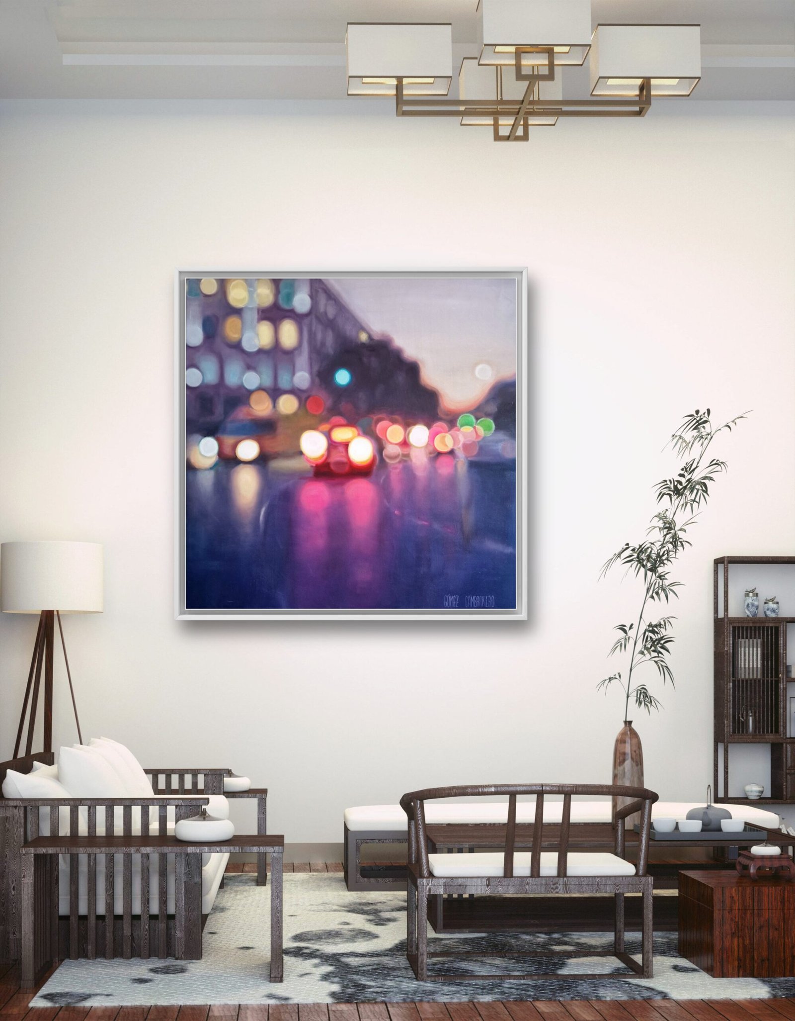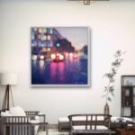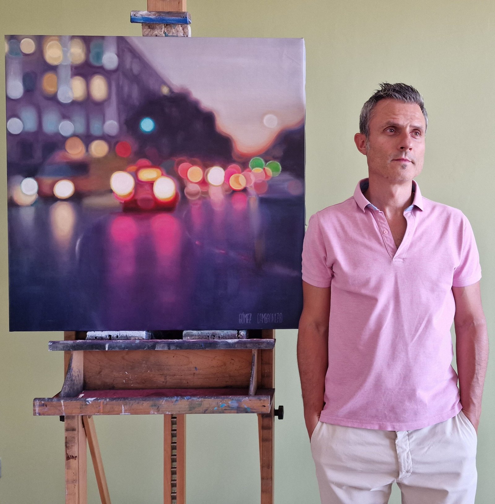 This work is part of the series “Urban Nights” that includes, among others, paintings that portray the night in cities. They tell of the relationship with their surroundings and their people. The lights engulf the night and bathe the surrounding areas, creating a dance of colours and brightness. The reflections of the cars, which come and go incessantly, and the shop windows, show the unbridled activity of the city, fast and beautiful, like life itself. Up close it seems like an almost abstract landscape, but when you take a step back the work emerges.