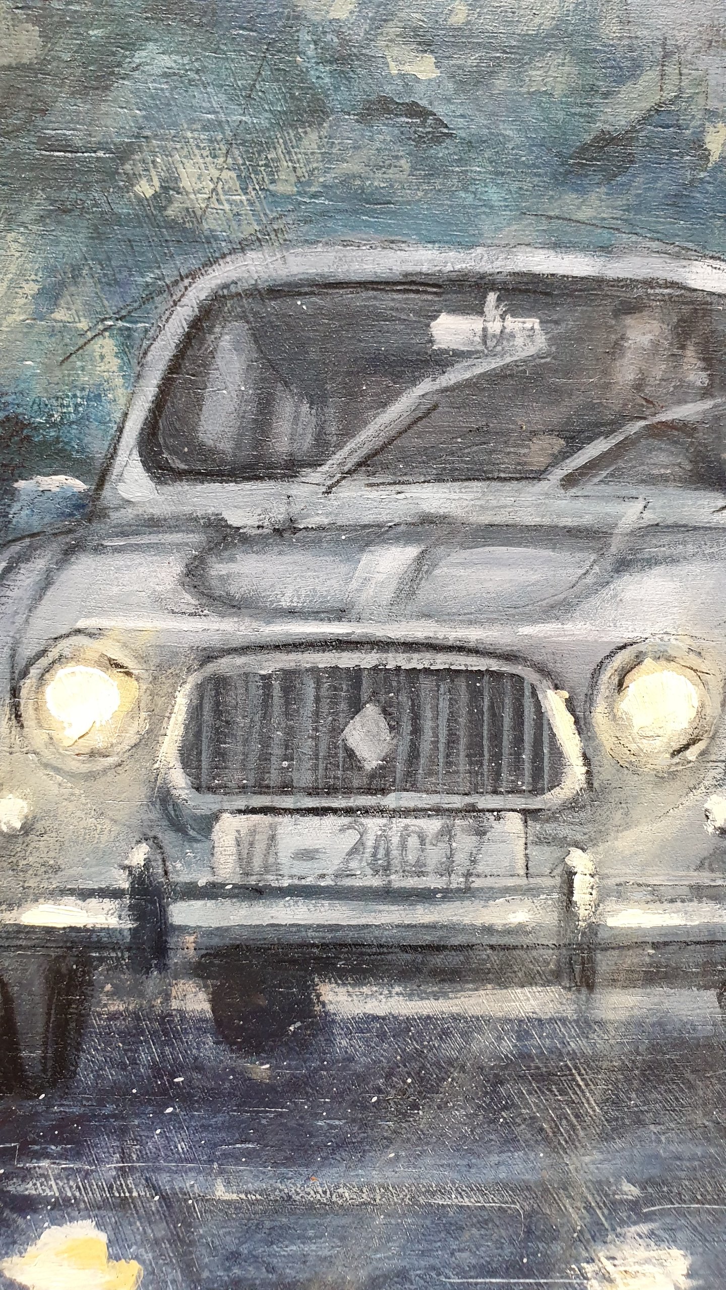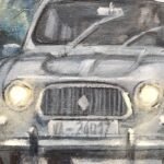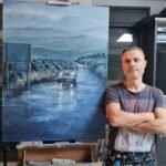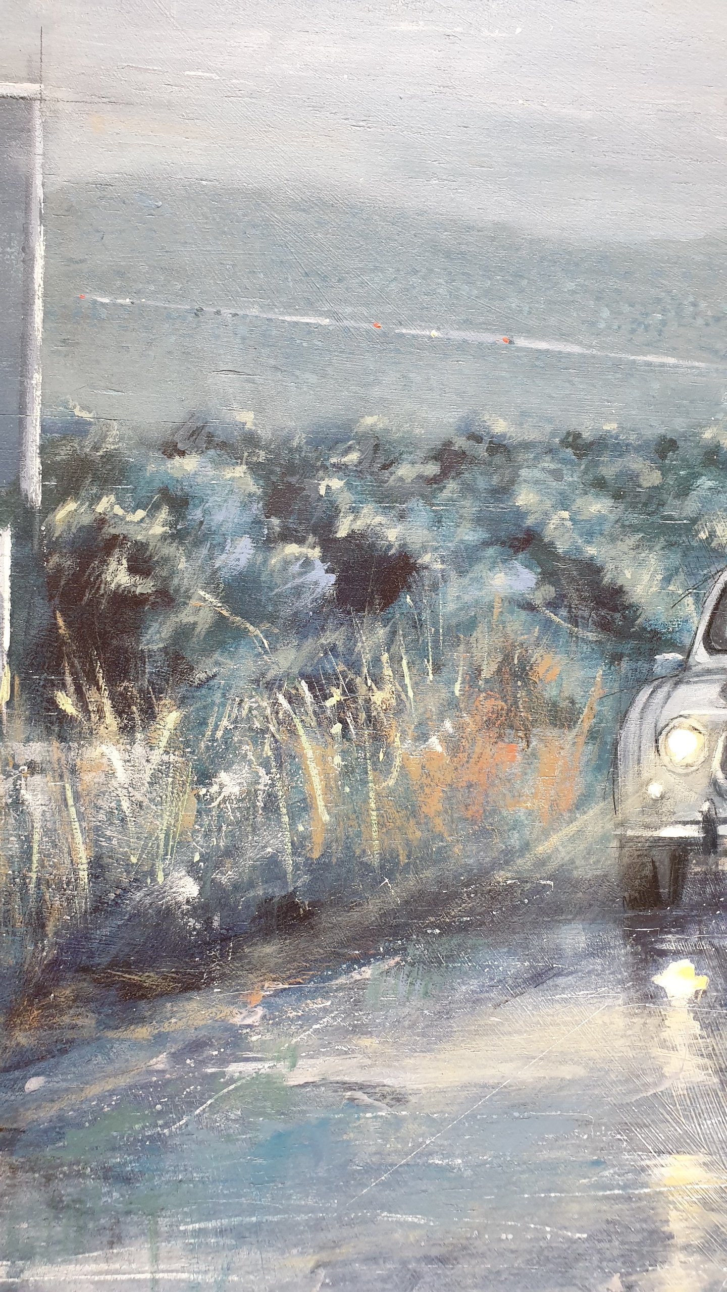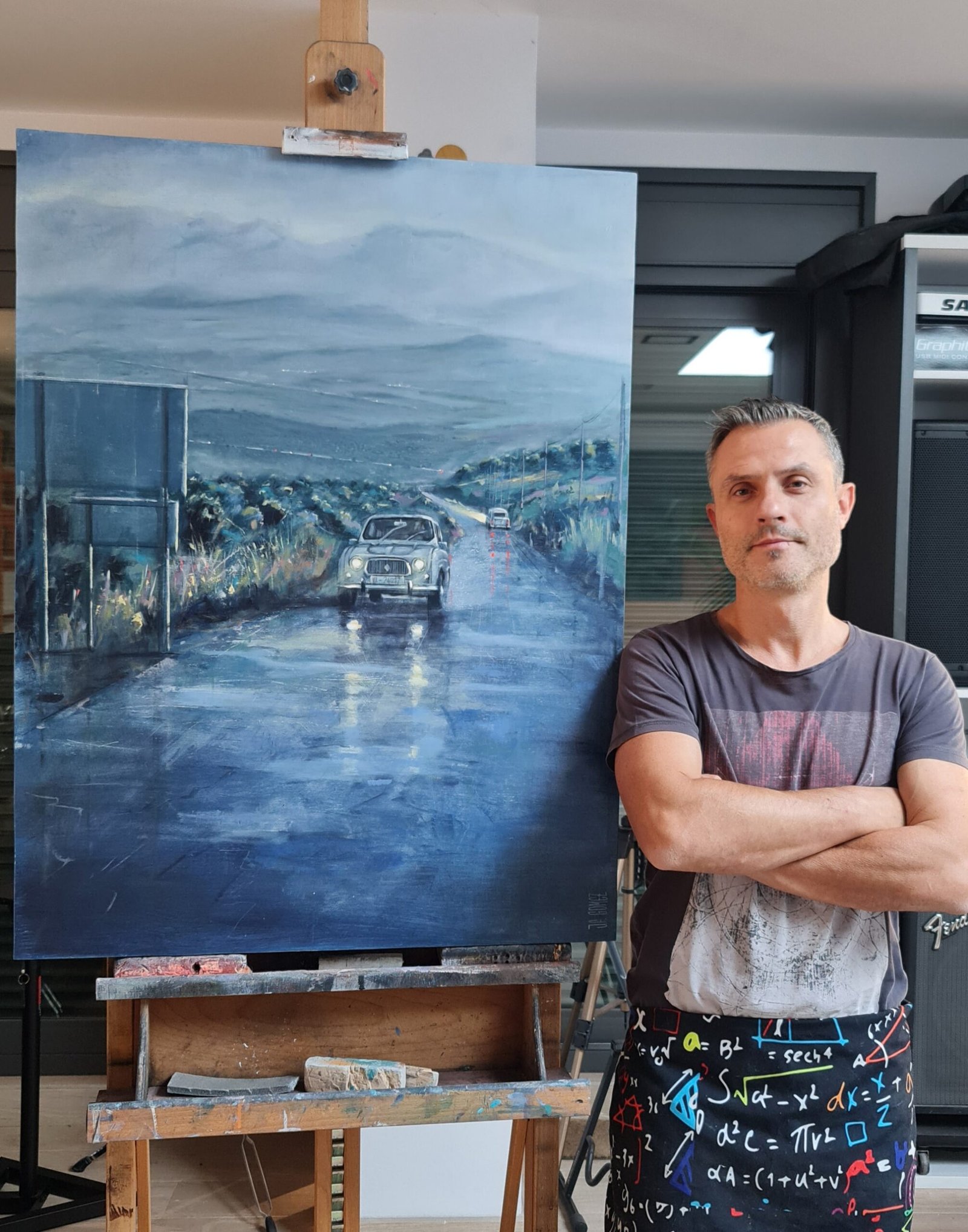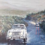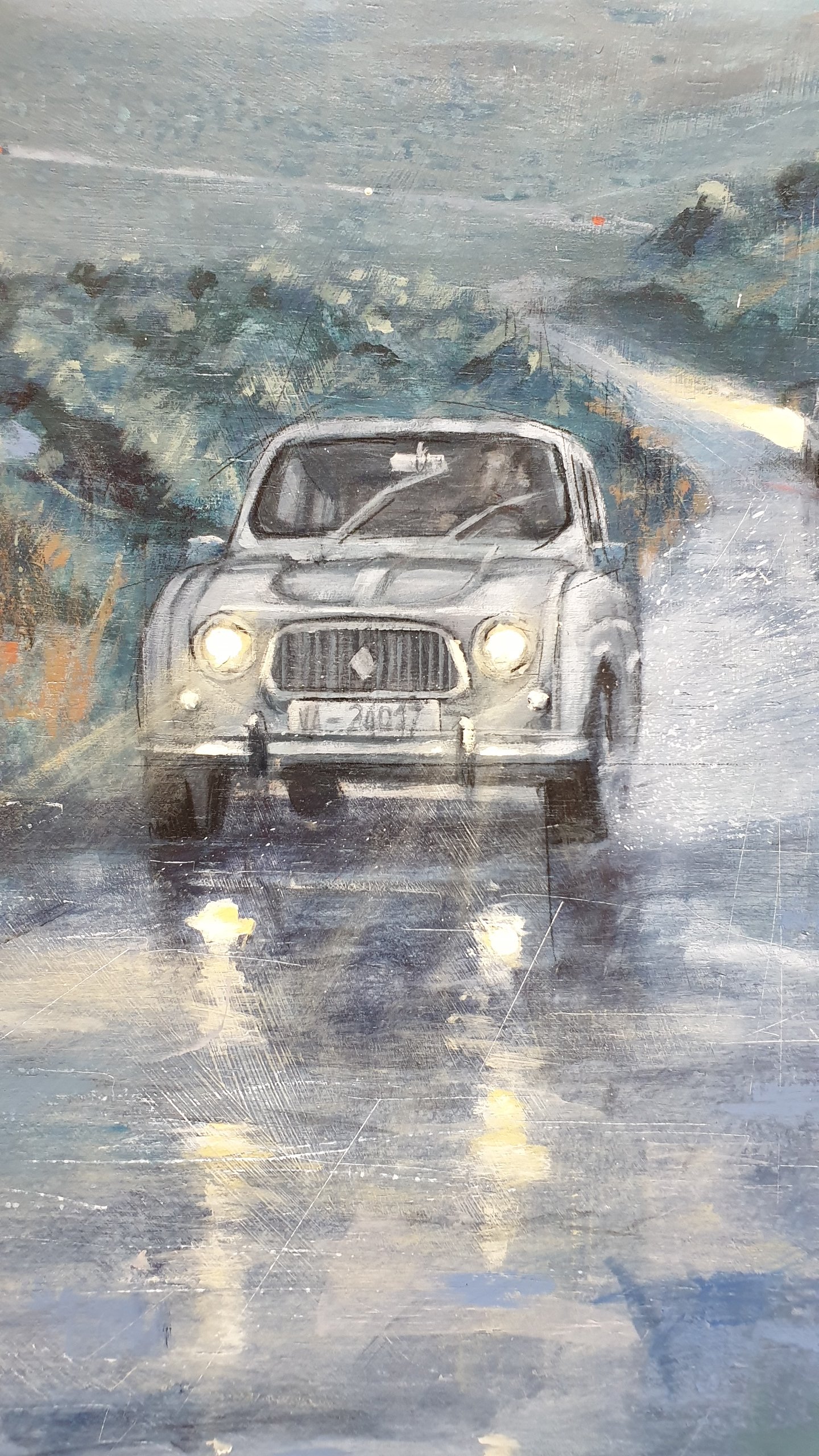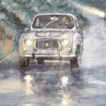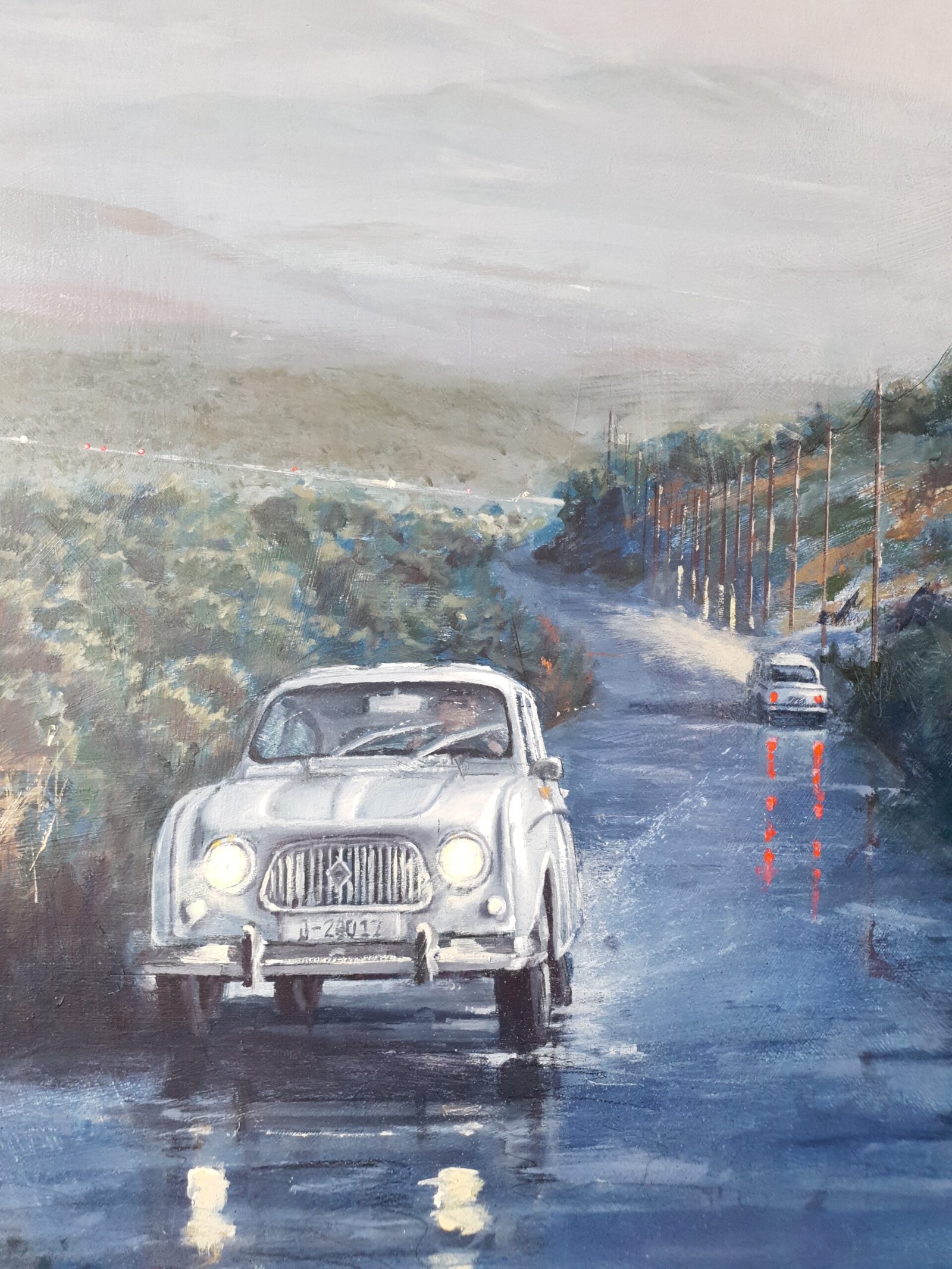 In this work, blue and grey predominate. The day begins with rain in a mountainous area. The fog blurs the distant elements. The falling water turns the road into a mirror of reflections. A Renault 4 L car advances along the winding road with its lights on. In the background another car disappears in the distance, but not before stepping on the brakes and leaving a reddish flash on the road... Our tradition, popular architecture and customs in contrast with the evolution that cities, rural landscapes and roads have experienced over time and ideas.
