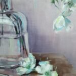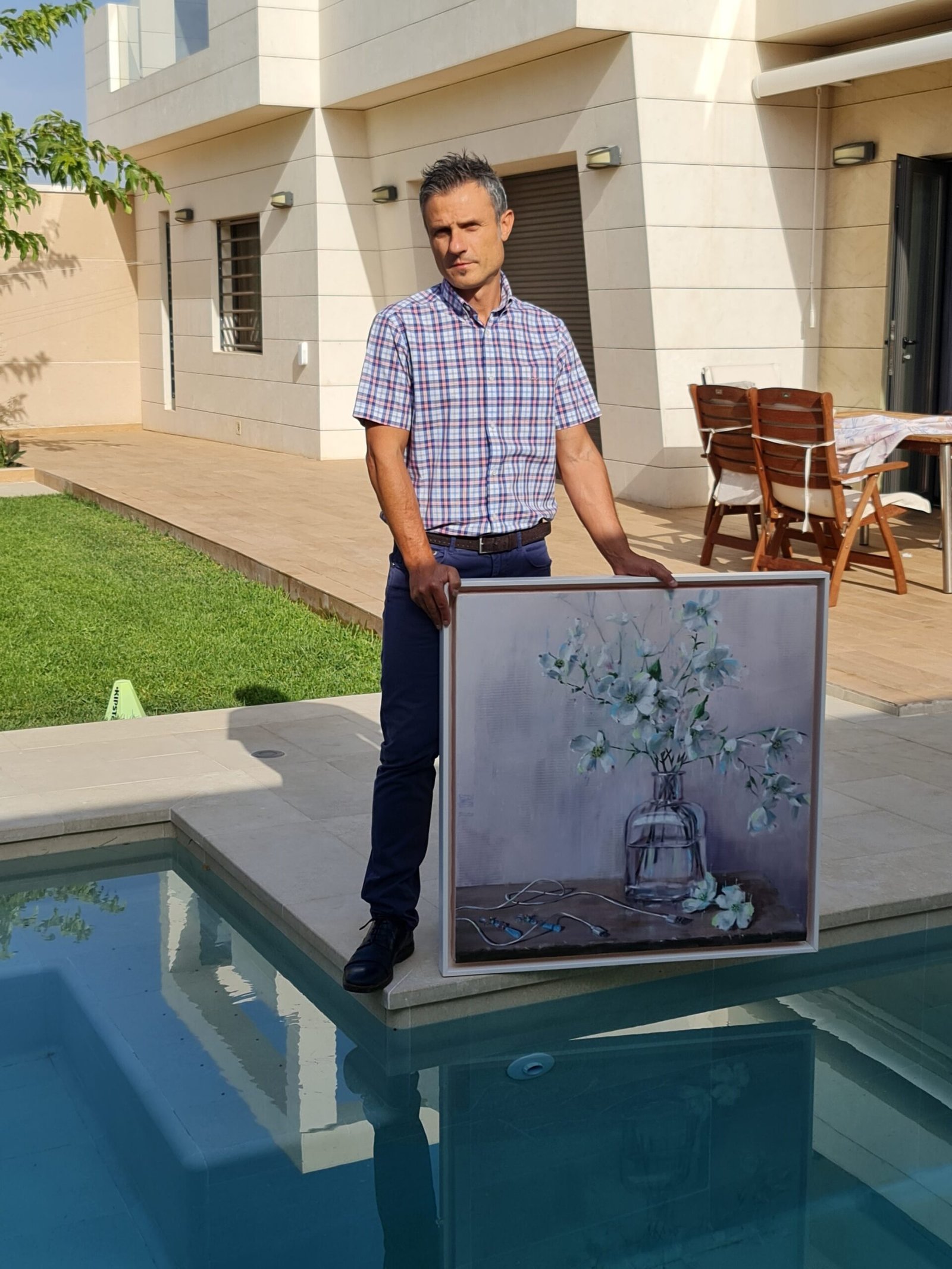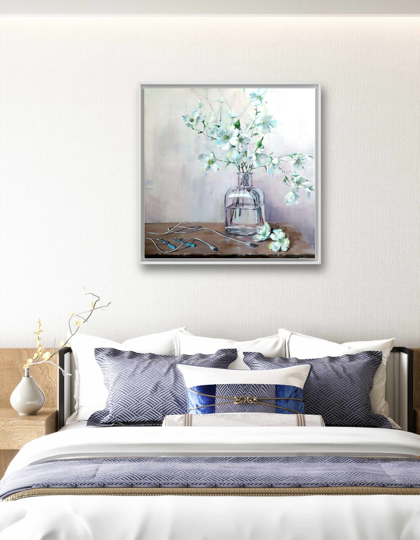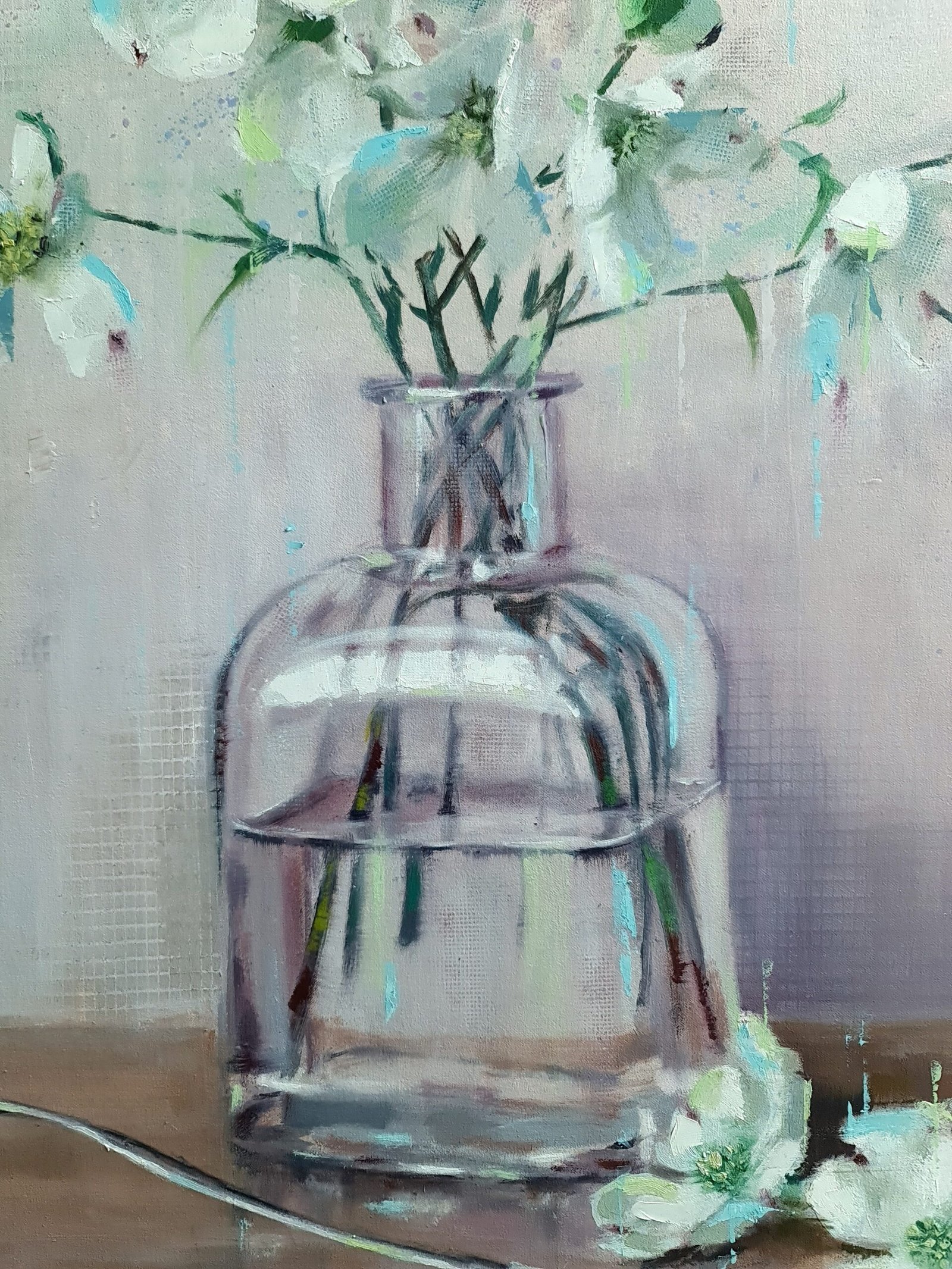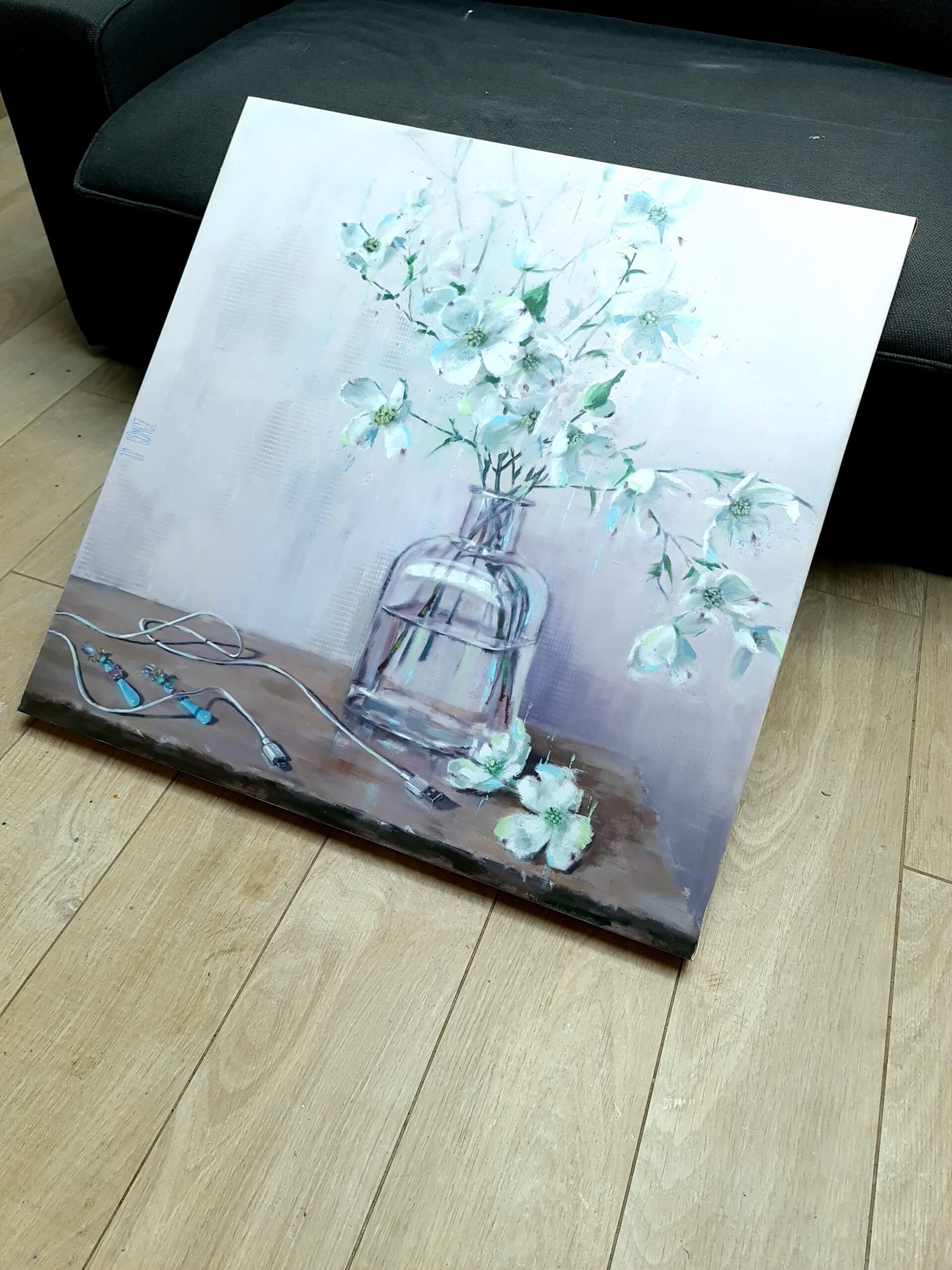 This work belongs to the Plants, Flowers and Everyday Objects series. In this case, life is given by some branches of very lively white flowers, placed in a pink glass vase with a little water. The object is provided by some earrings that the protagonist must have quickly taken off when she got home at night and a USB charger cable, the kind that are in every house today... Together they form a perfect combination to decorate any space and bring life, movement and modernity. Very gestural brushstrokes and impastos of blue, green and white tones give the work great dynamism and contemporary character. This work has been exhibited at the ART3F contemporary art fair in Monaco.