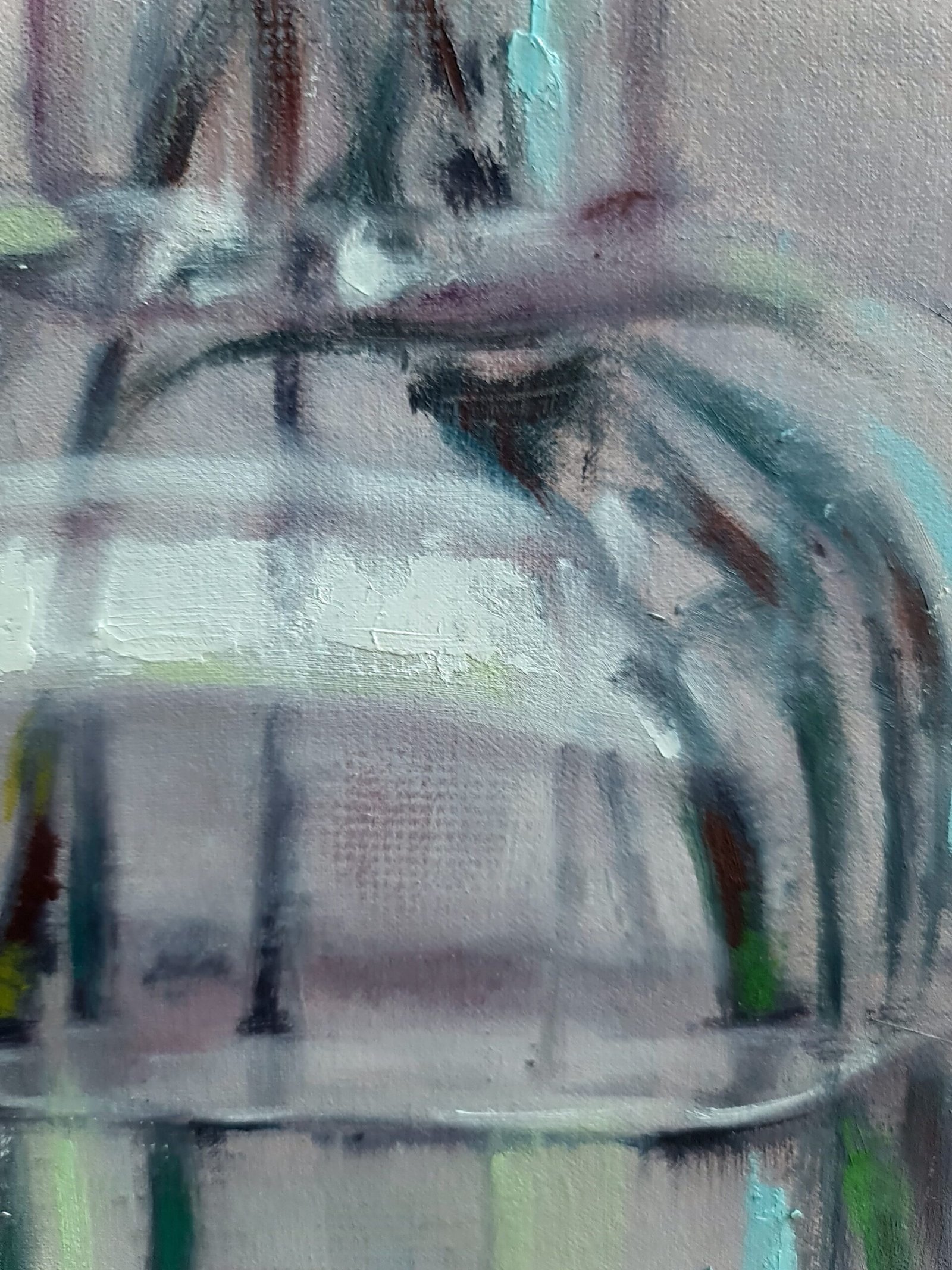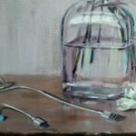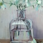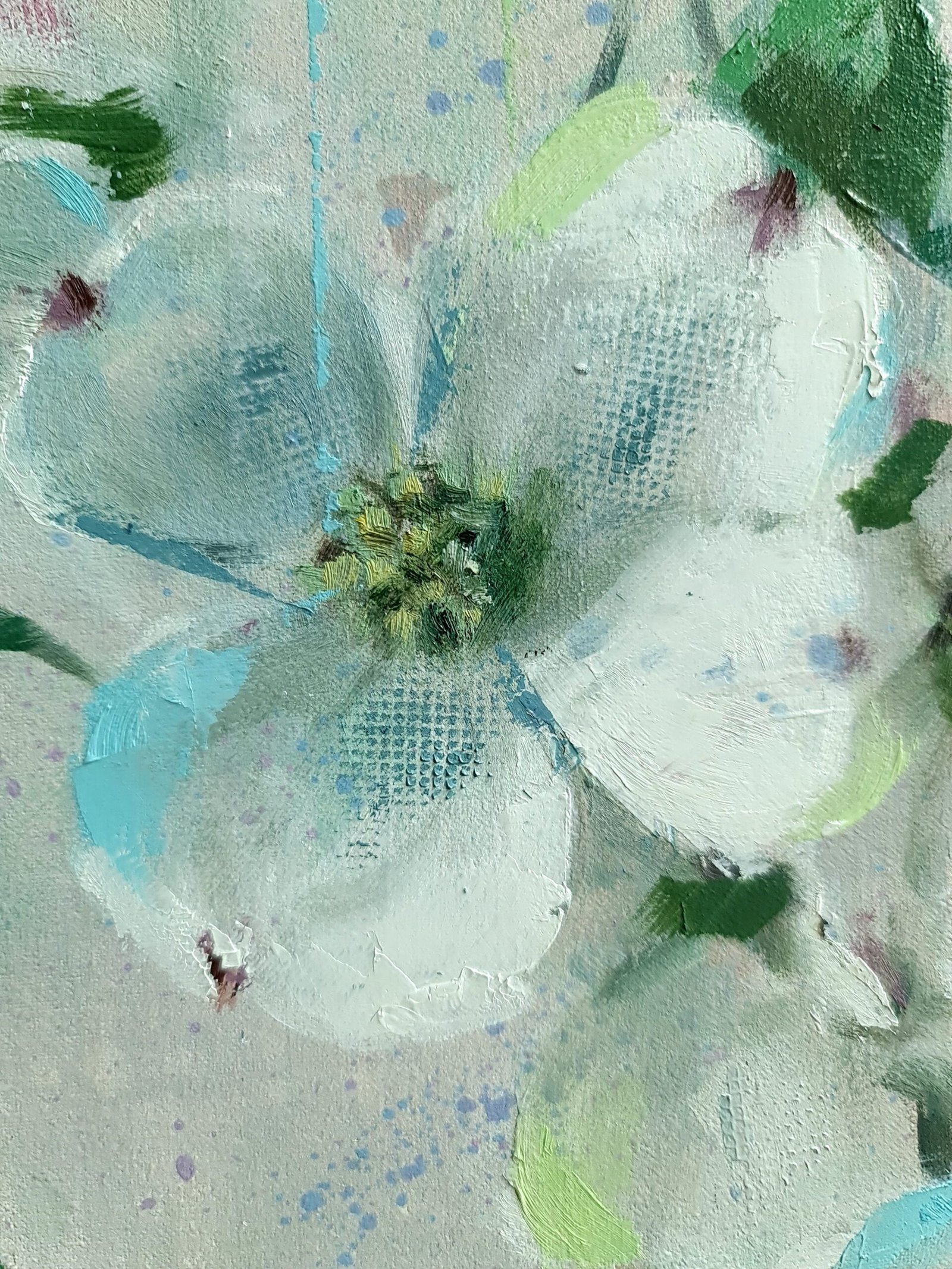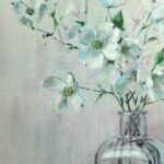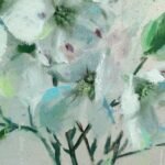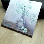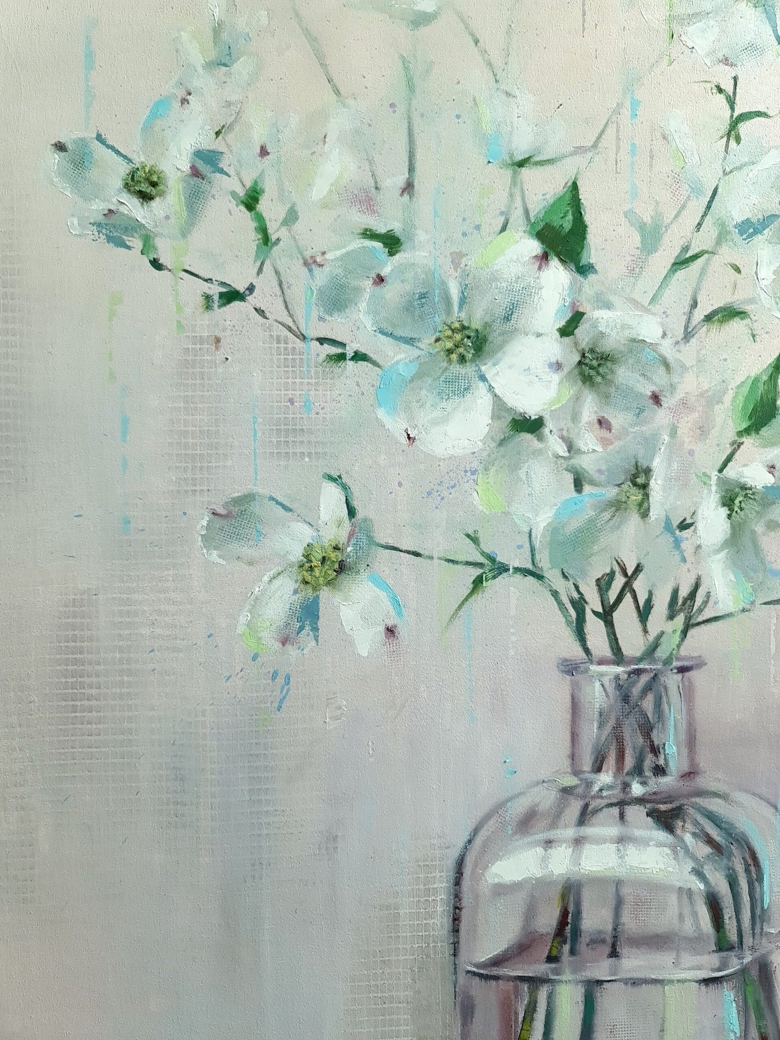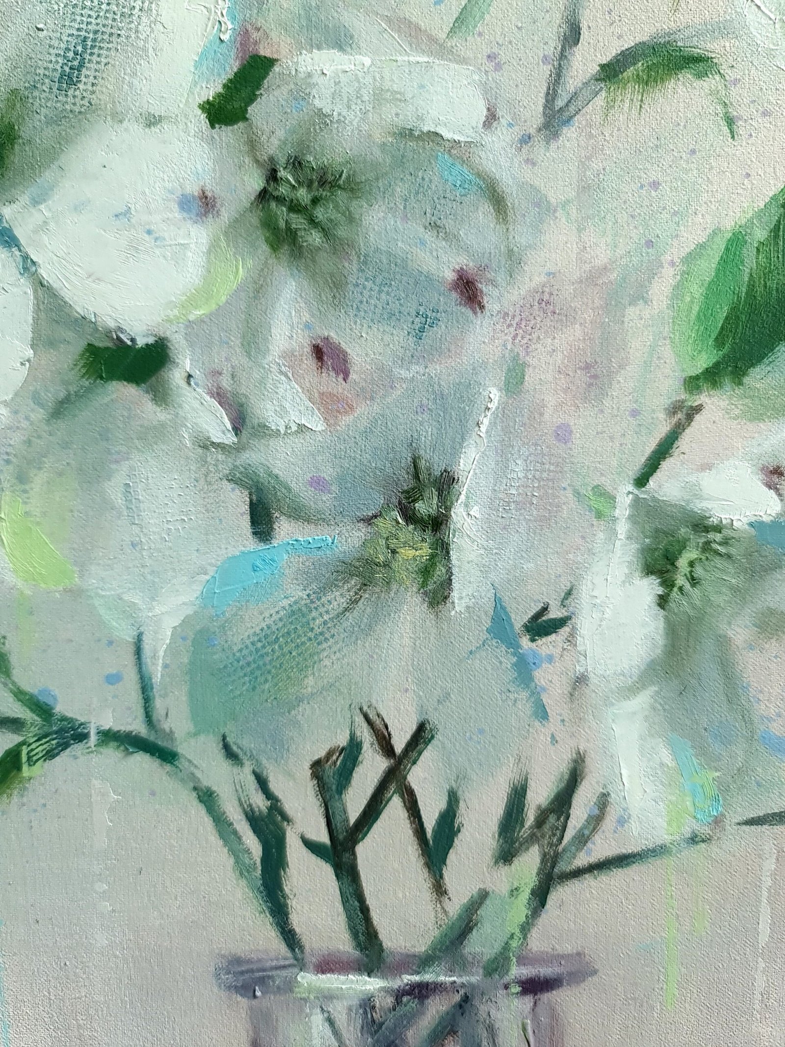 This work belongs to the Plants, Flowers and Everyday Objects series. In this case, life is given by some branches of very lively white flowers, placed in a pink glass vase with a little water. The object is provided by some earrings that the protagonist must have quickly taken off when she got home at night and a USB charger cable, the kind that are in every house today... Together they form a perfect combination to decorate any space and bring life, movement and modernity. Very gestural brushstrokes and impastos of blue, green and white tones give the work great dynamism and contemporary character. This work has been exhibited at the ART3F contemporary art fair in Monaco.